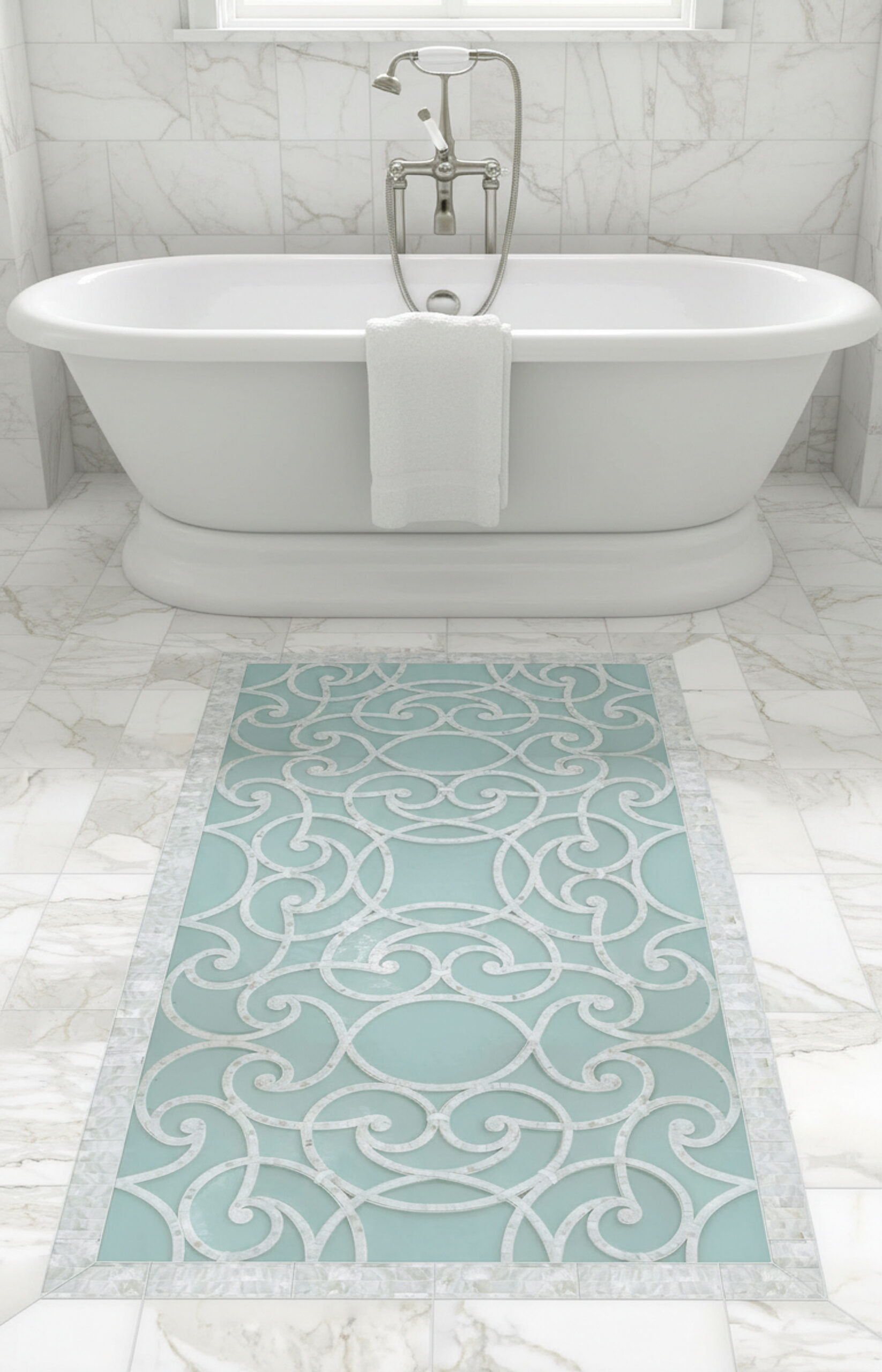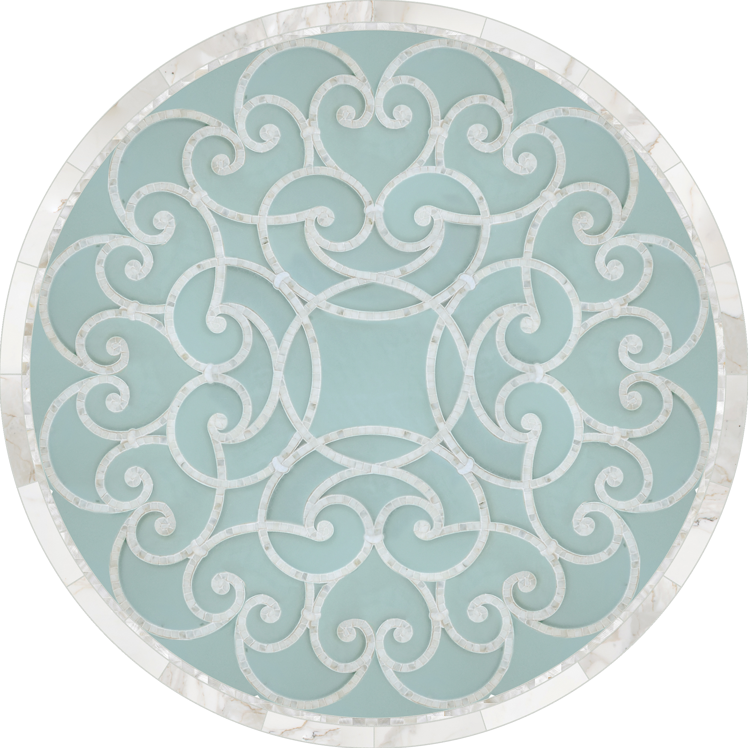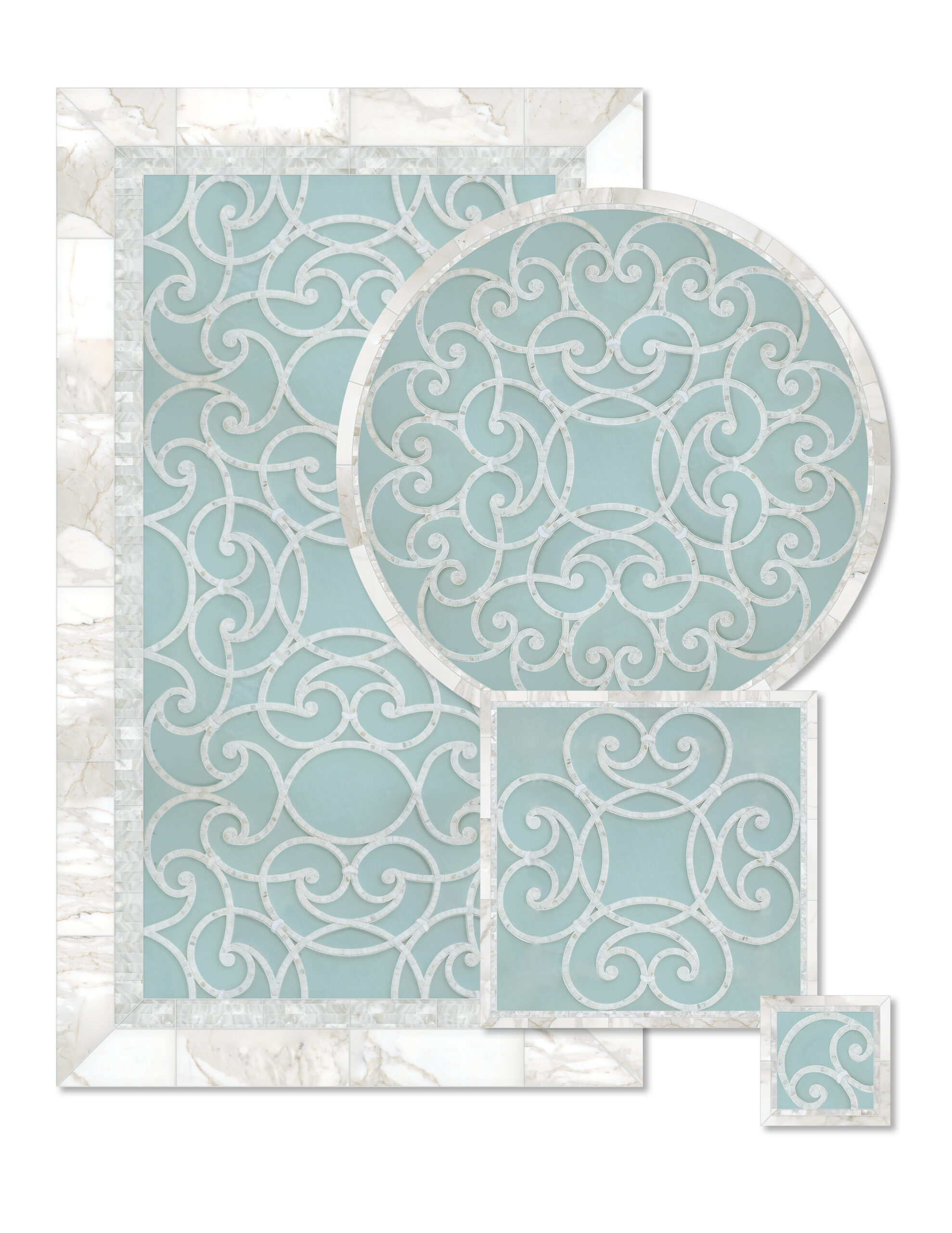 Custom Abigail Medallions and Rugs shown in Shoal glass, Shell, and Calacatta.