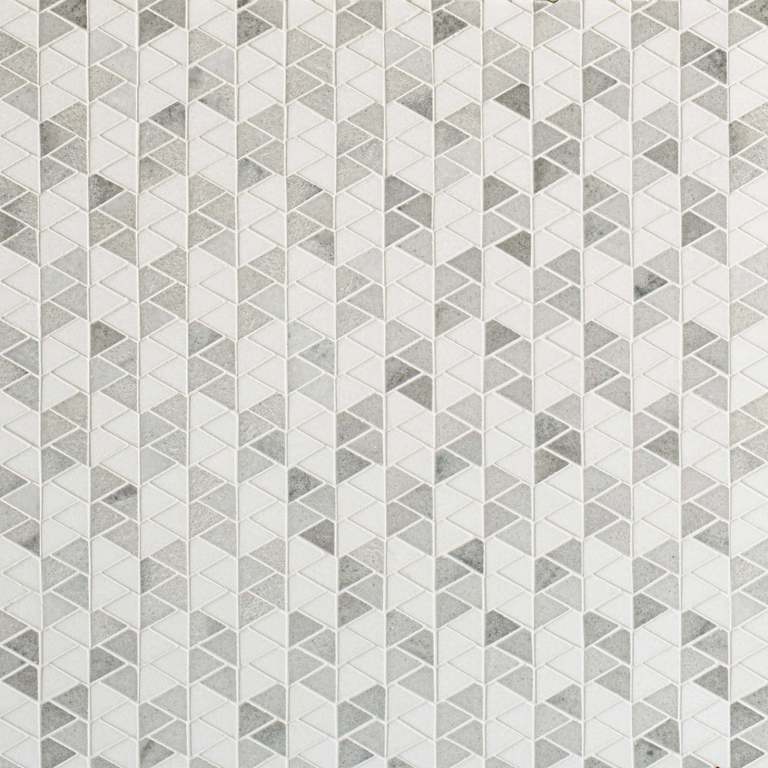 Atlantic Petite, a waterjet cut mosaic, shown in honed Thassos and Angora, is part of the Old Castle collection Jacquelyn Bizzotto for New Ravenna.