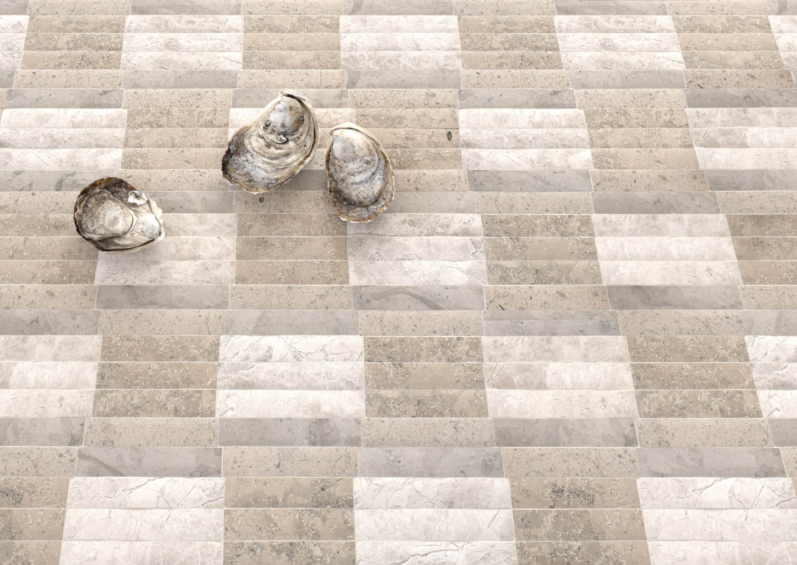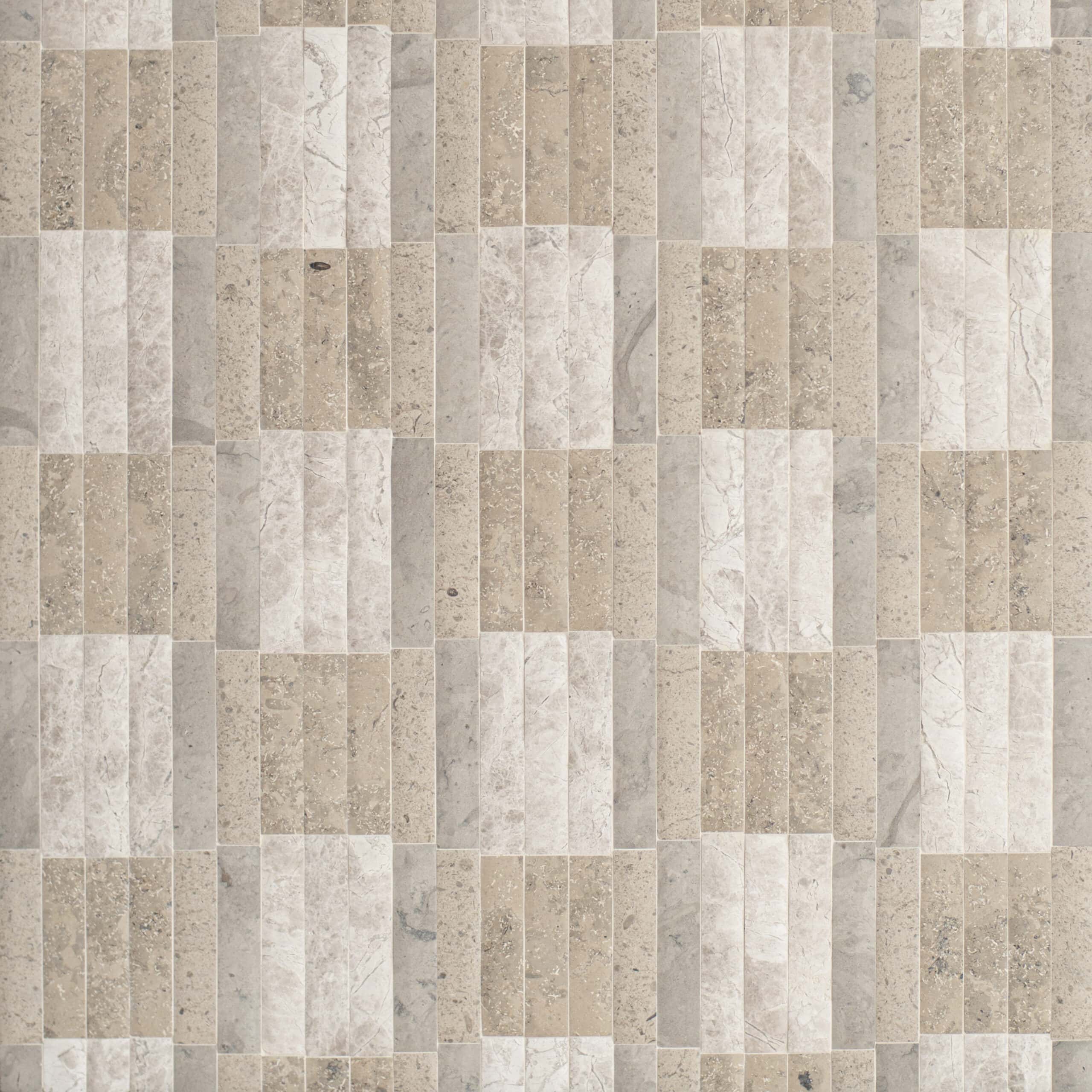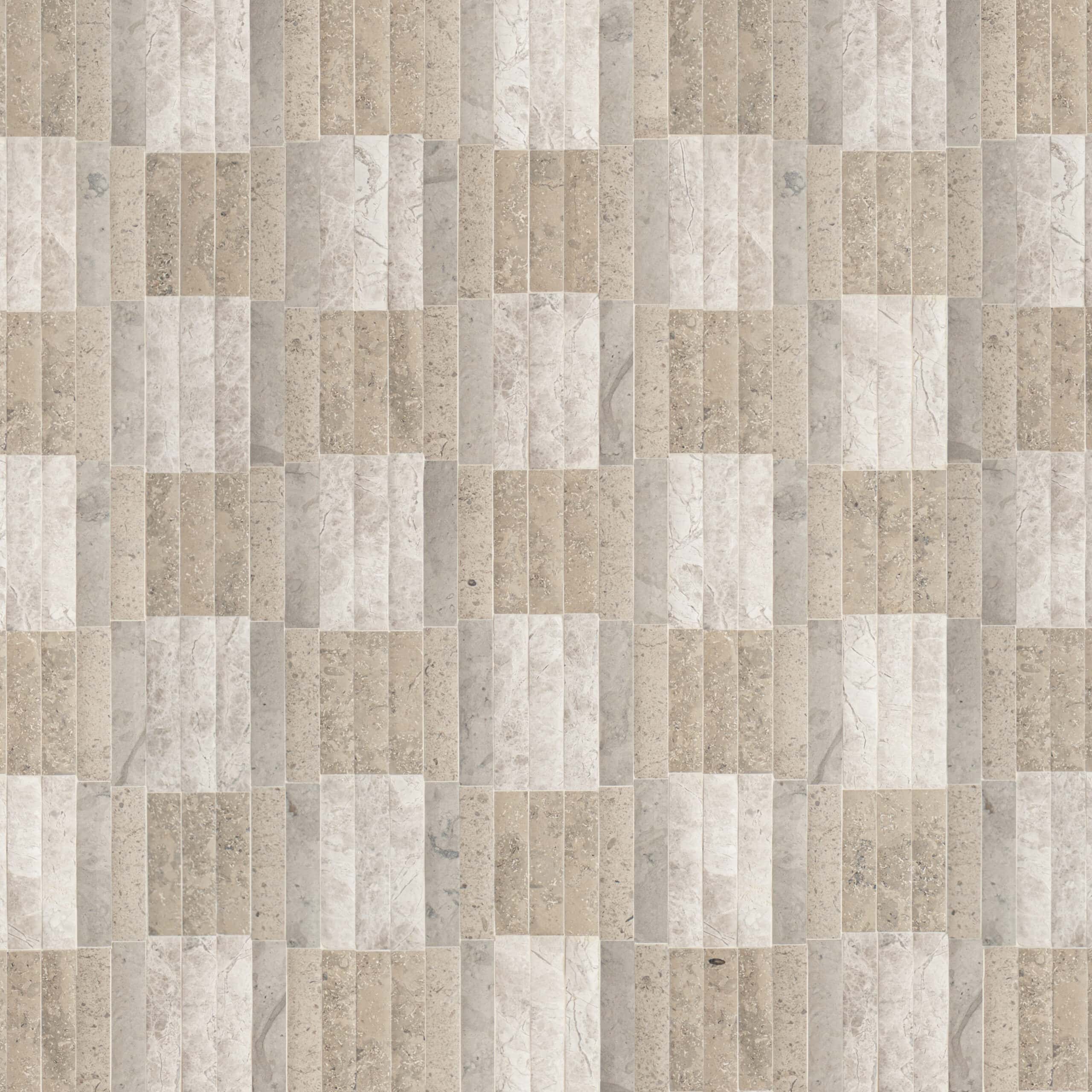 Barlow, a hand-cut stone mosaic, shown in venetian honed Gascogne Blue, Stratus, Palomar, and Jura Grey, is part of the Old Castle collection Jacquelyn Bizzotto for New Ravenna.