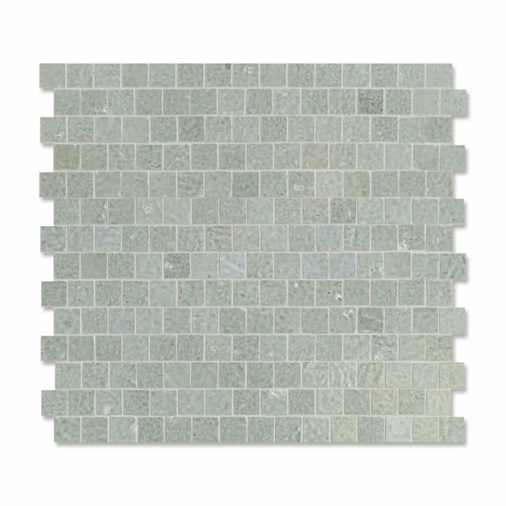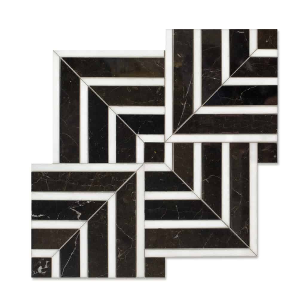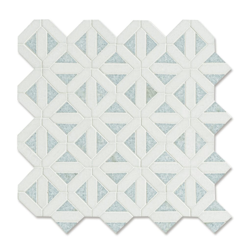Bayside, a hand-cut glass and waterjet mosaic, shown in Obsidian, Lavastone, Alabaster, Pearl, Galena, Champagne, Moonstone, Absolute White, Labradorite, Desert Rose, Fluorite jewel glass, is part of the Old Castle collection by Jacquelyn Bizzotto for New Ravenna.