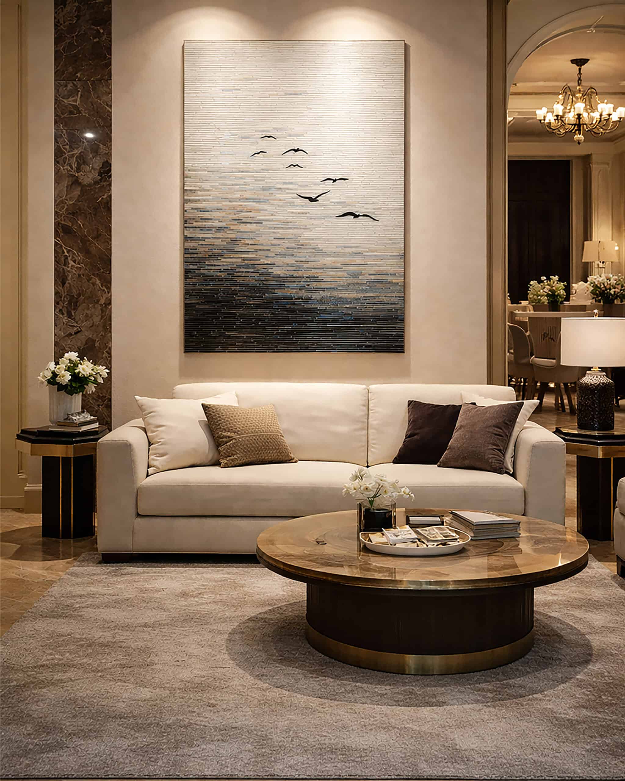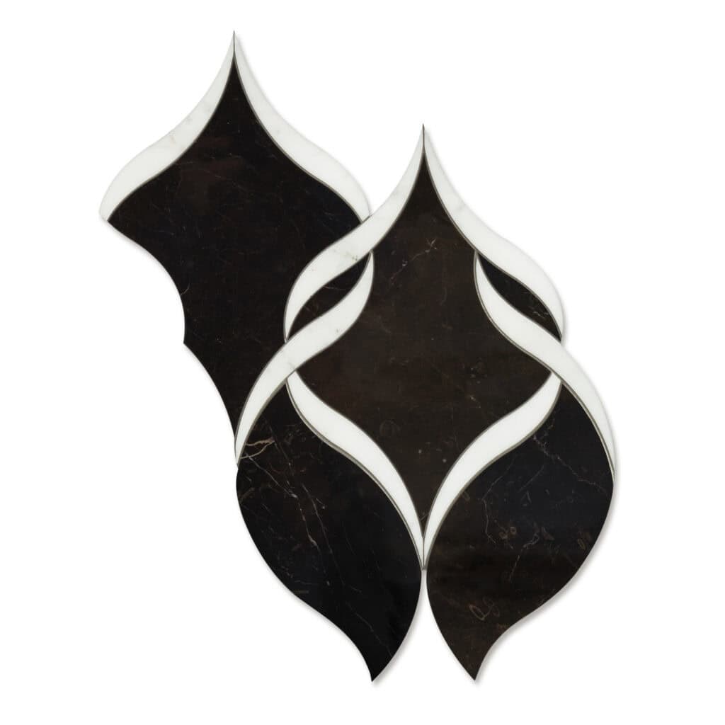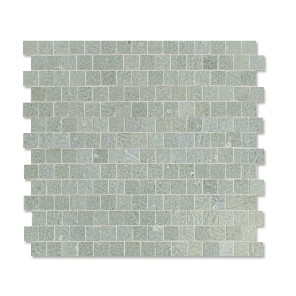 Bayside, a hand-cut glass and waterjet mosaic, shown in Obsidian, Lavastone, Alabaster, Pearl, Galena, Champagne, Moonstone, Absolute White, Labradorite, Desert Rose, Fluorite jewel glass, is part of the Old Castle collection by Jacquelyn Bizzotto for New Ravenna.