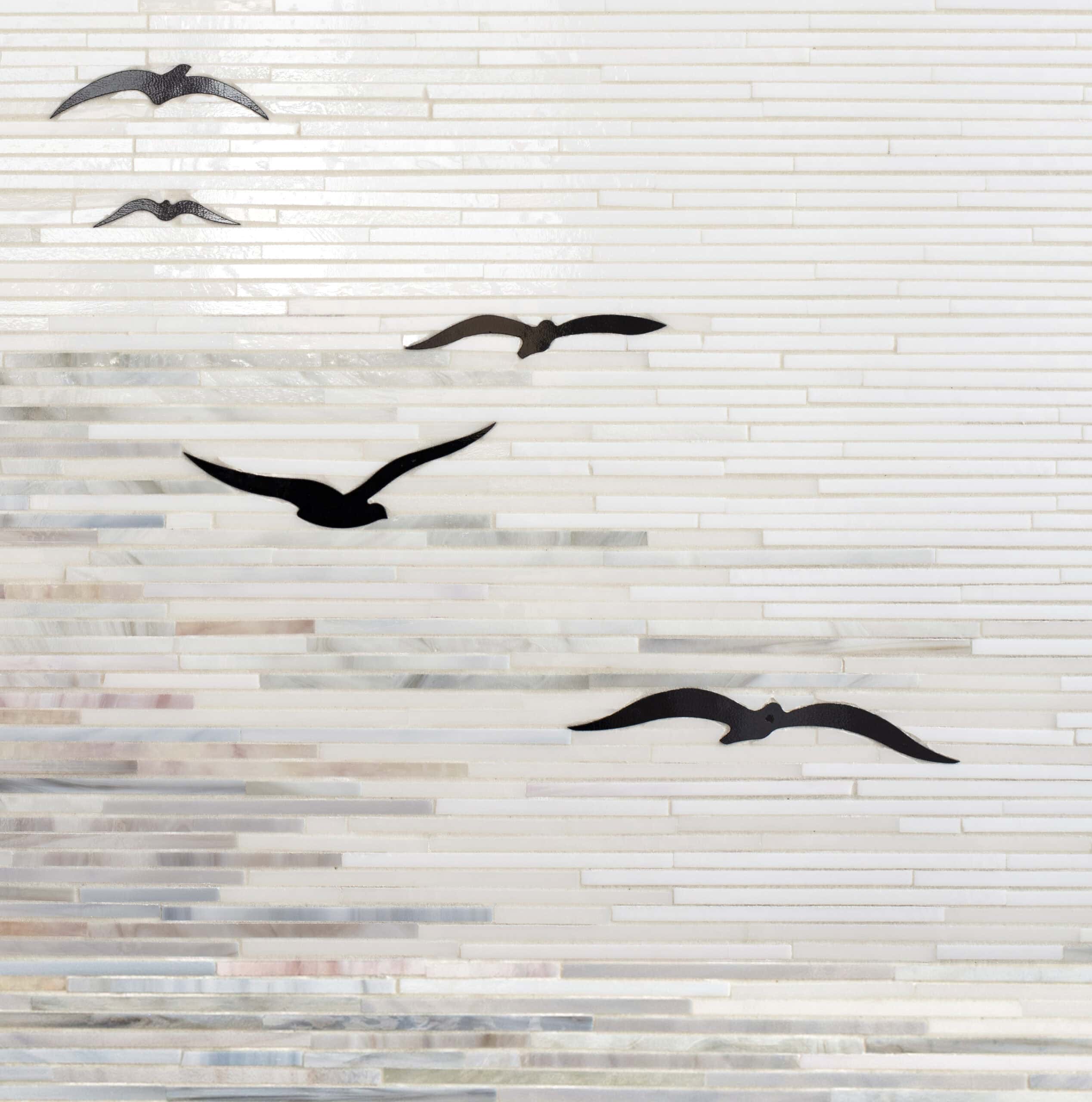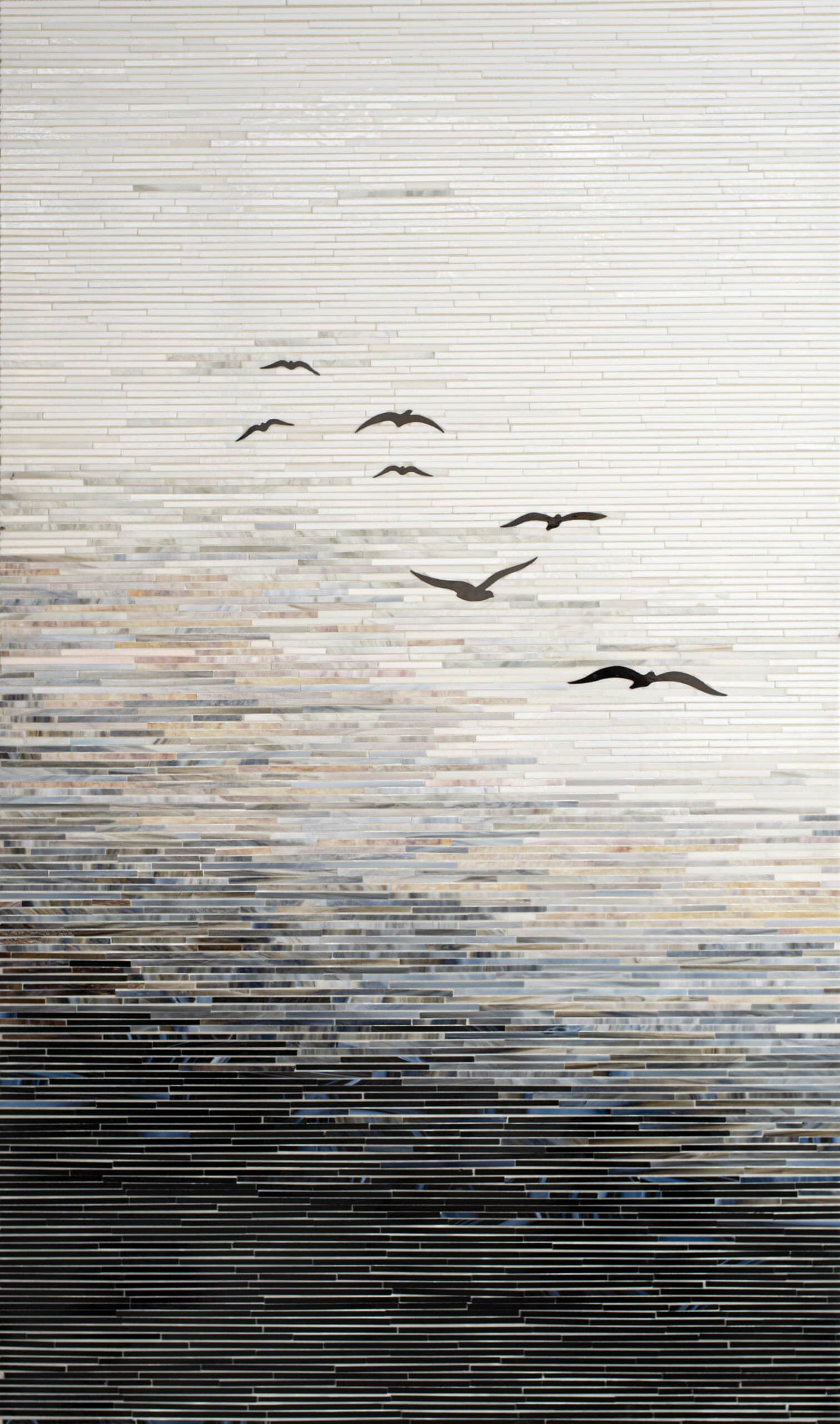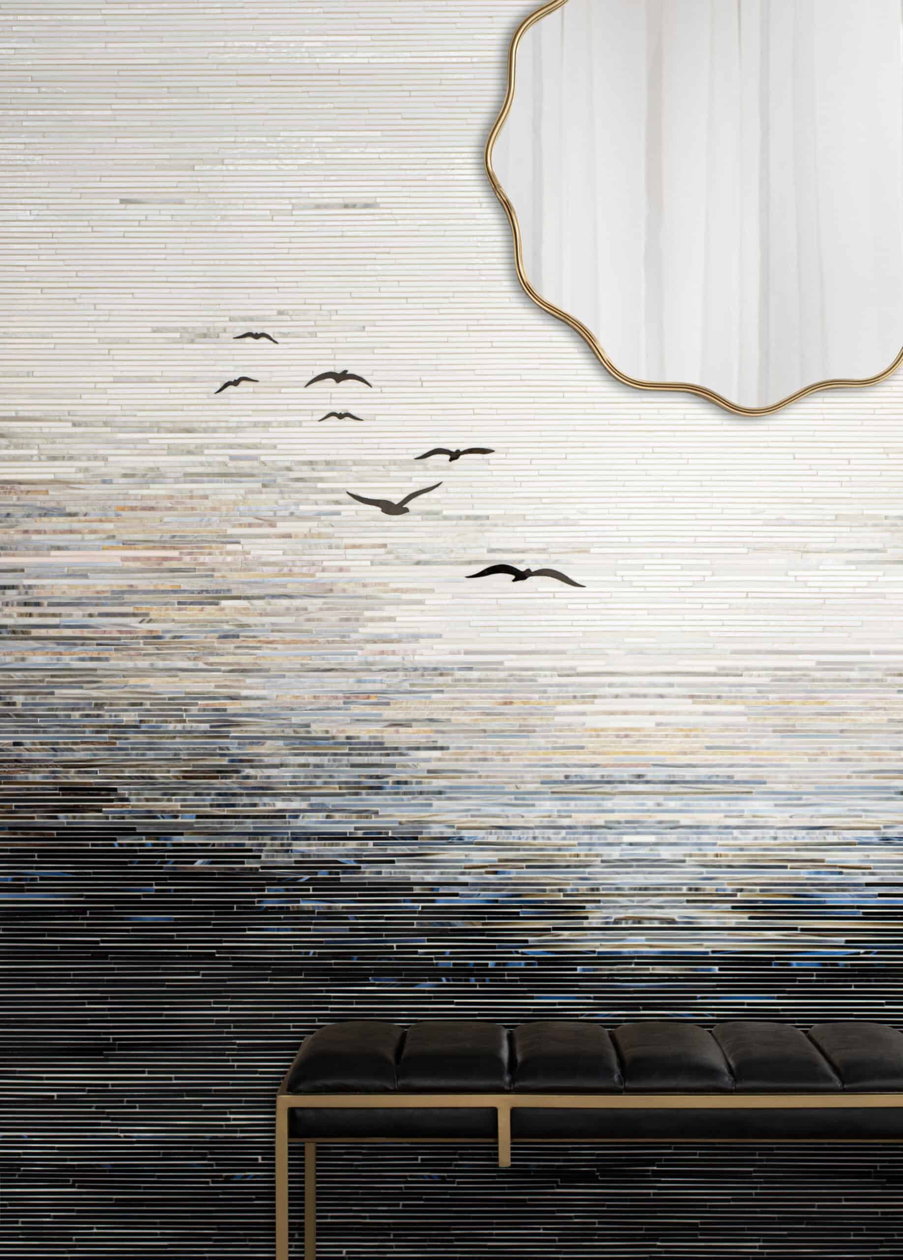 Bayside, a hand-cut glass and waterjet mosaic, shown in Obsidian, Lavastone, Alabaster, Pearl, Galena, Champagne, Moonstone, Absolute White, Labradorite, Desert Rose, Fluorite jewel glass, is part of the Old Castle collection Jacquelyn Bizzotto for New Ravenna.