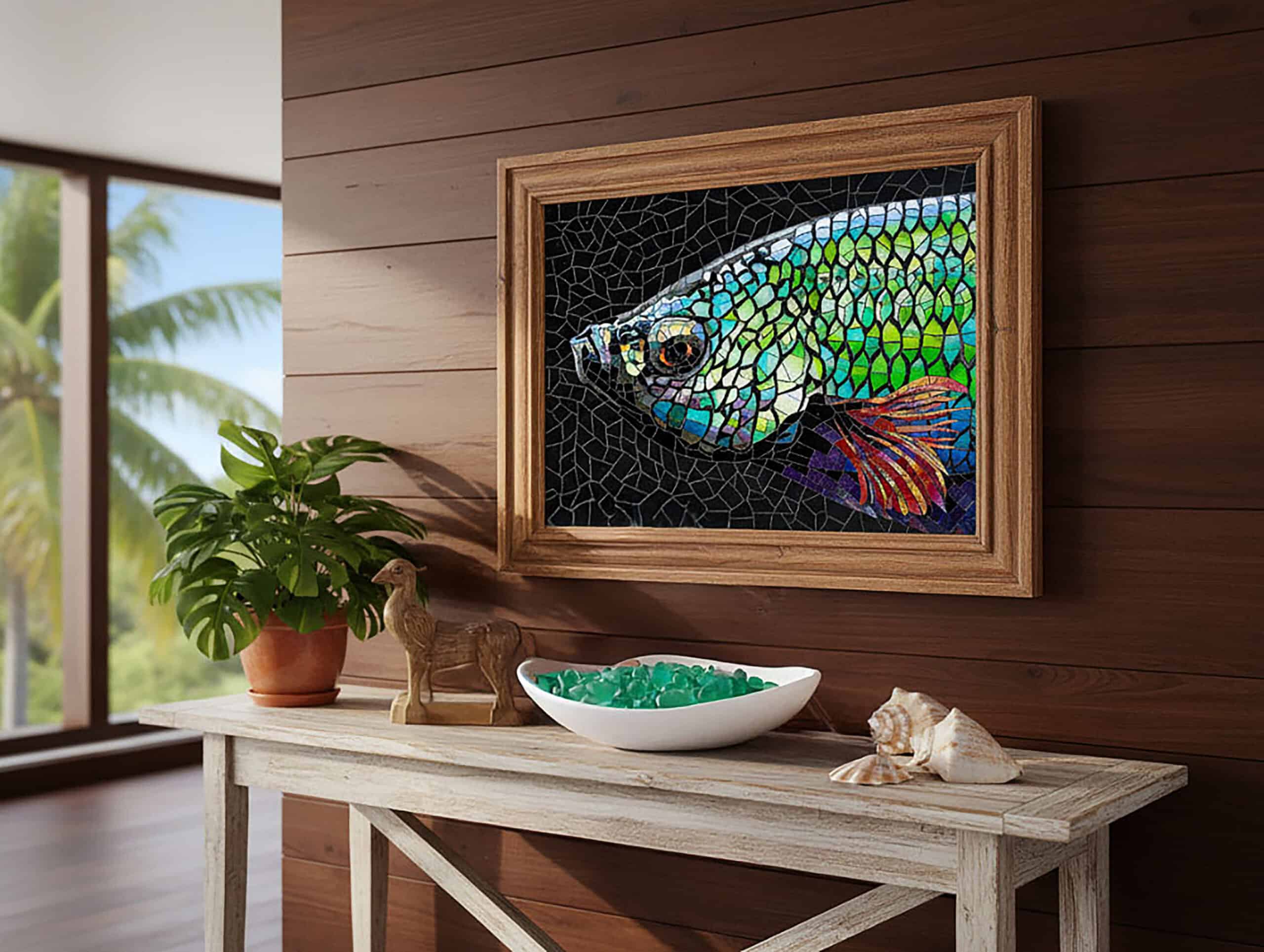 Custom 20″ x 14″ Beta by New Ravenna Master Mosaicist, Erica Dennison shown in Obsidian sea glass background with jewel glass design.