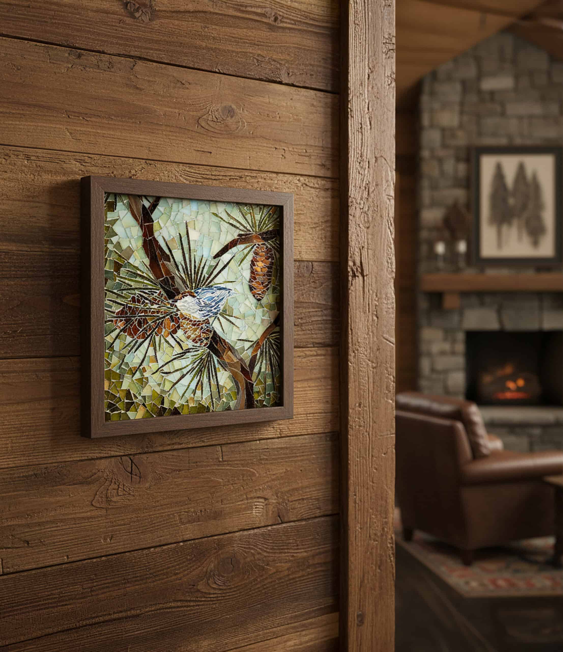 Custom 12″ x 12″ Brown-Headed Nuthatch by New Ravenna Designer and Master Mosaicist, Marcie McComb.