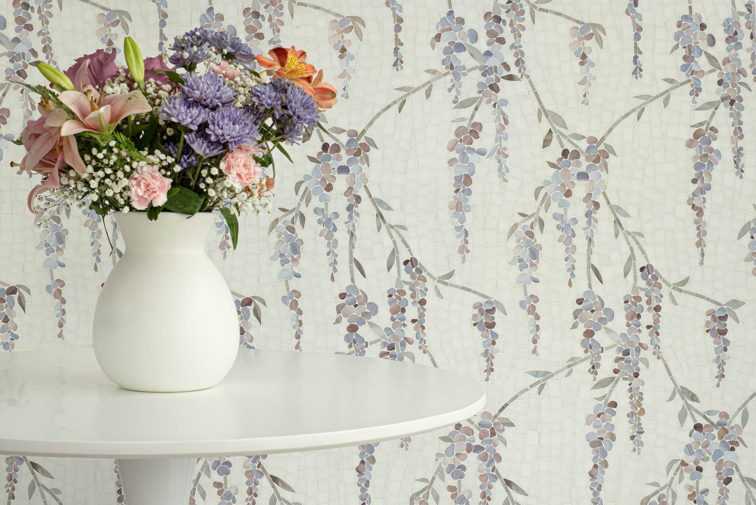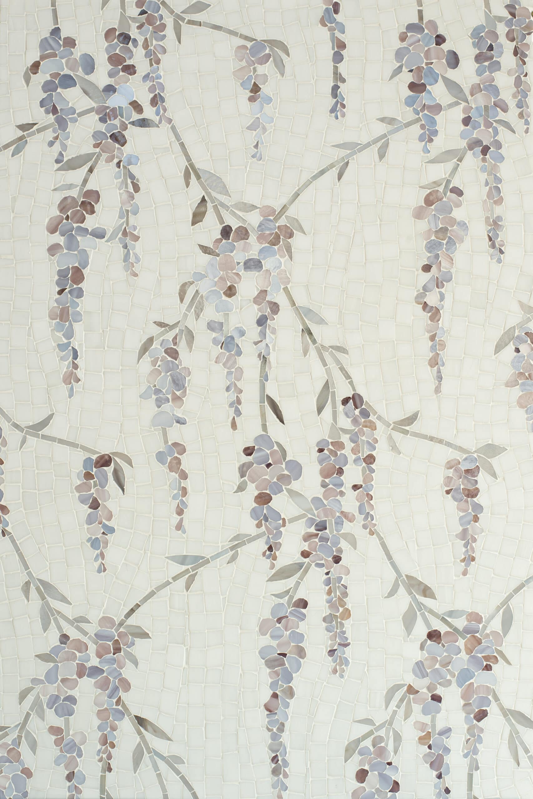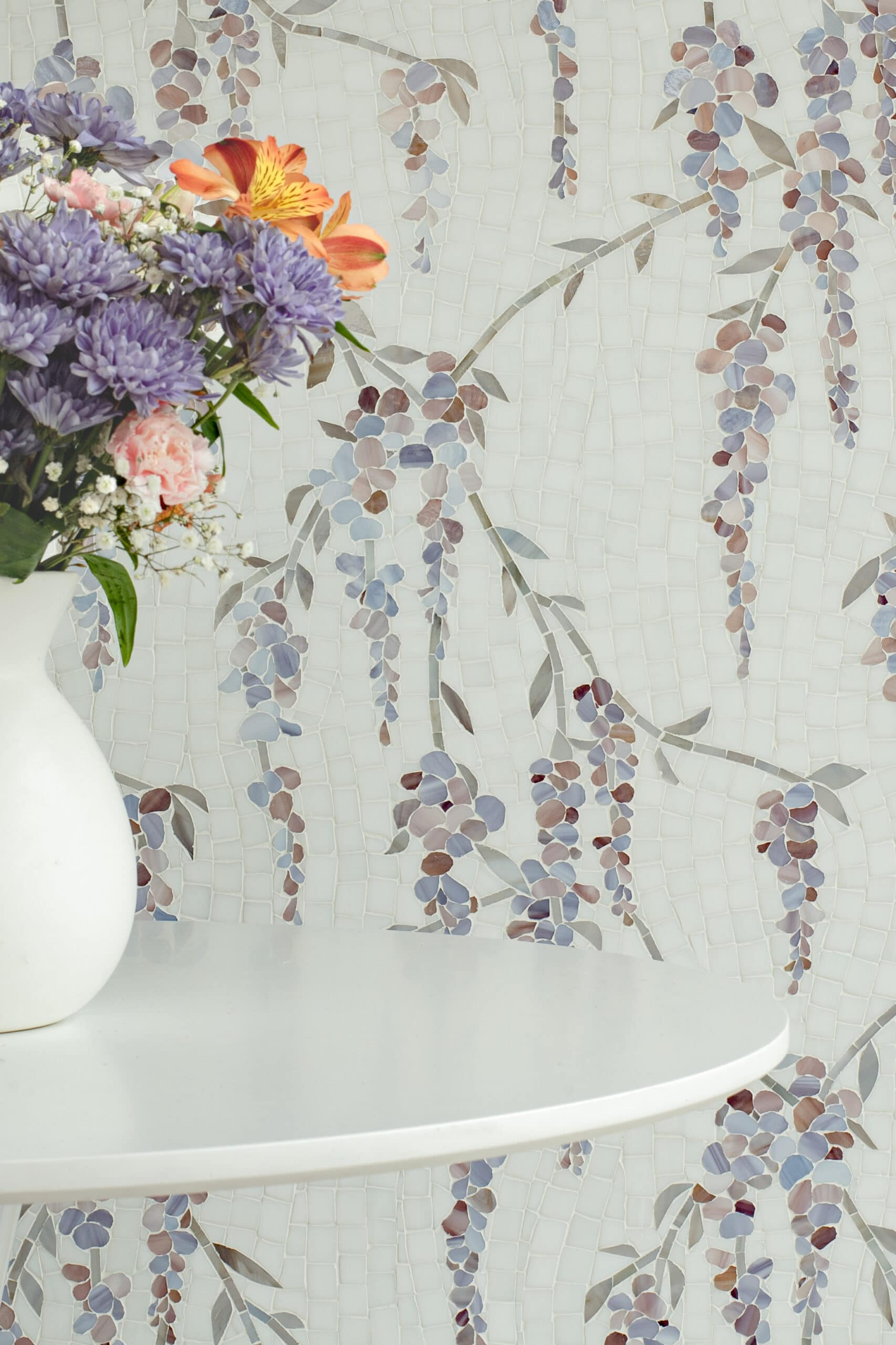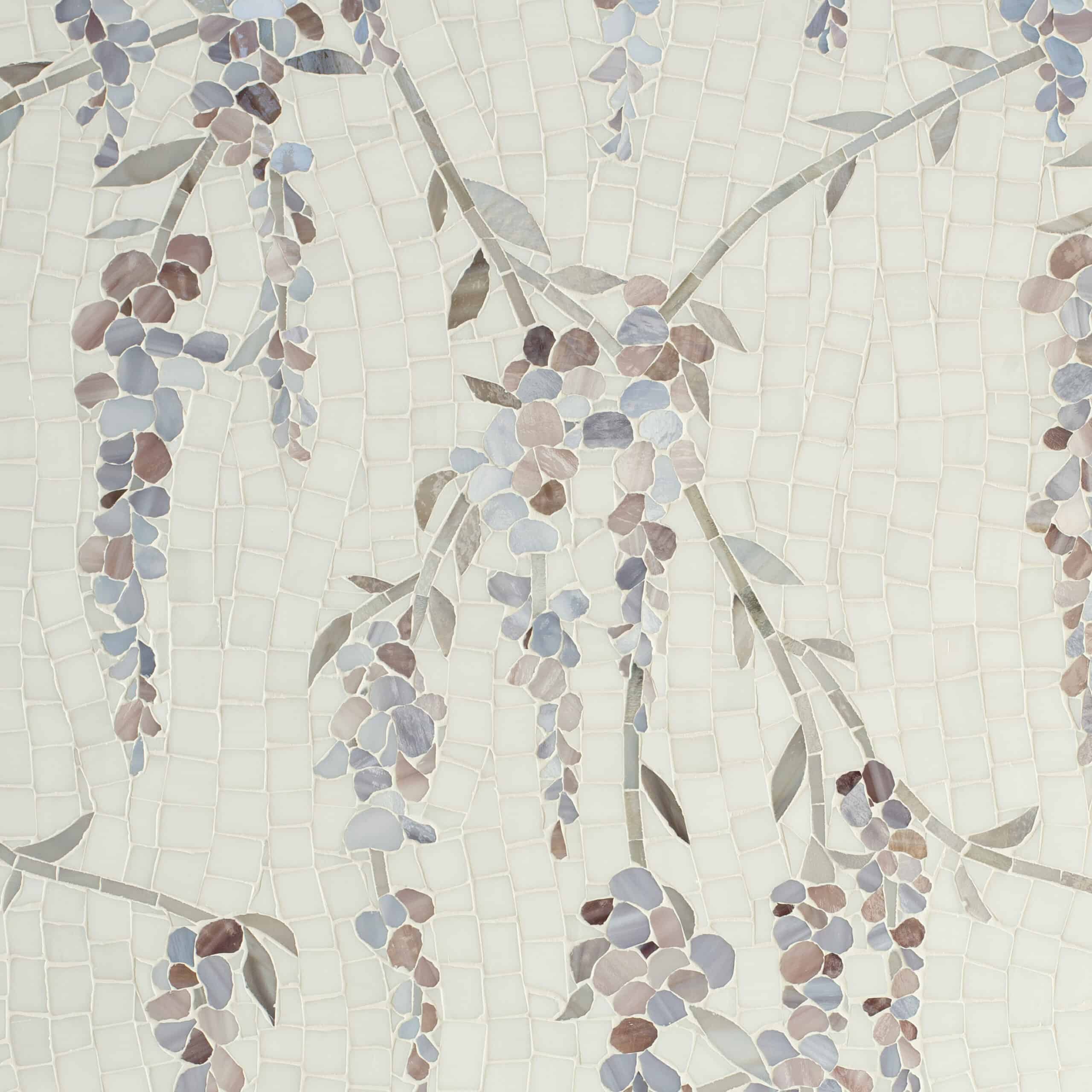 Cape Wisteria, a hand-cut glass mosaic, shown in Moonstone Sea Glass with Fluorite, Galena, Lace Agate, and Desert Rose jewel glass, is part of the Old Castle collection Jacquelyn Bizzotto for New Ravenna.