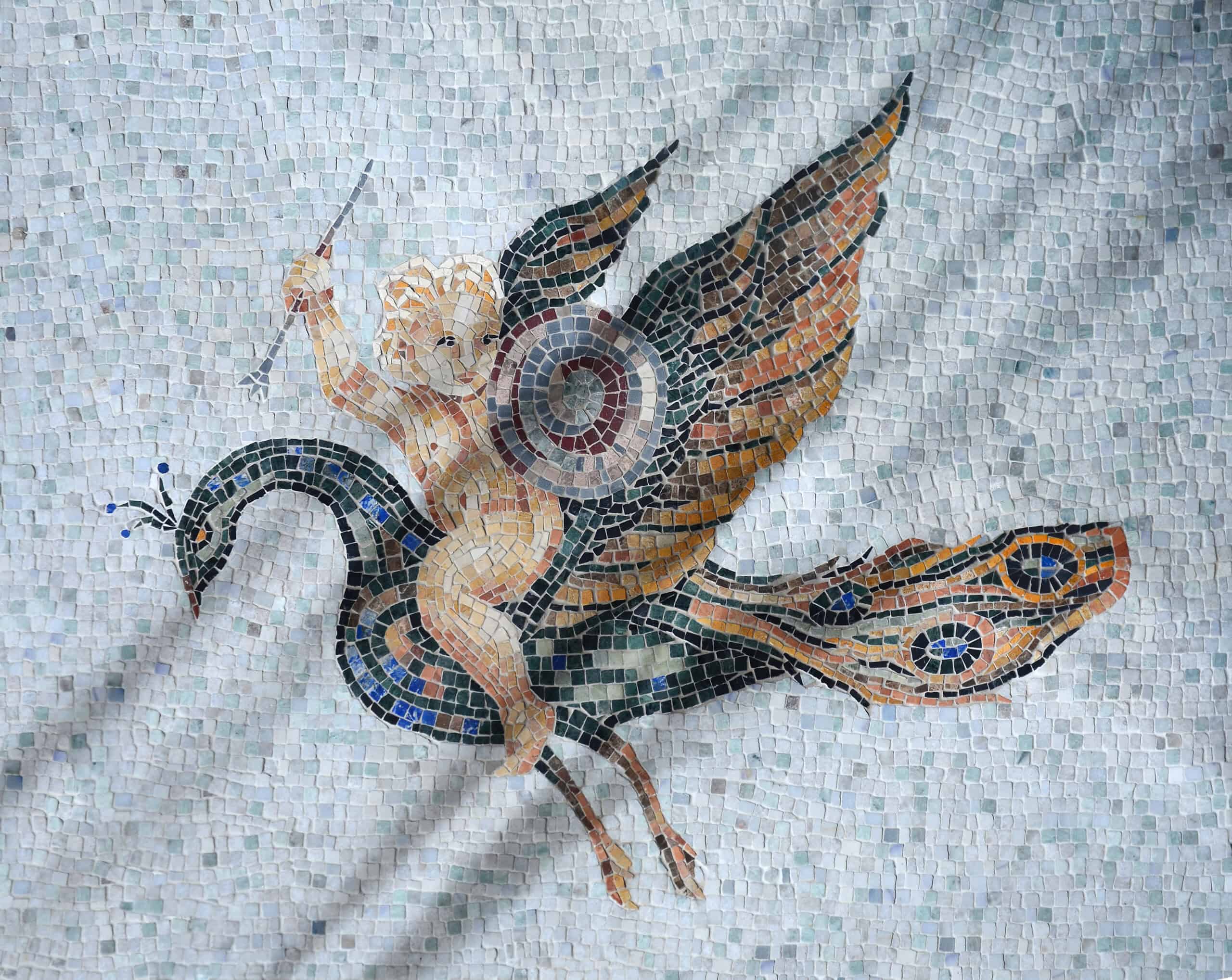 New Ravenna’s Cupid & Peacock logo, a hand-chopped tumbled stone mosaic, shown in Celeste, Lapis, Verde Alpi, Verde Luna, Nero Marquina, Giallo, Rosa Verona, Persian Gold, Aegean Brown, Renaissance Bronze, Travertine White, Bardiglio, Red Lake, Salmon Moss, Rose Bordeaux, Travertine Noce, and Verde Luna.