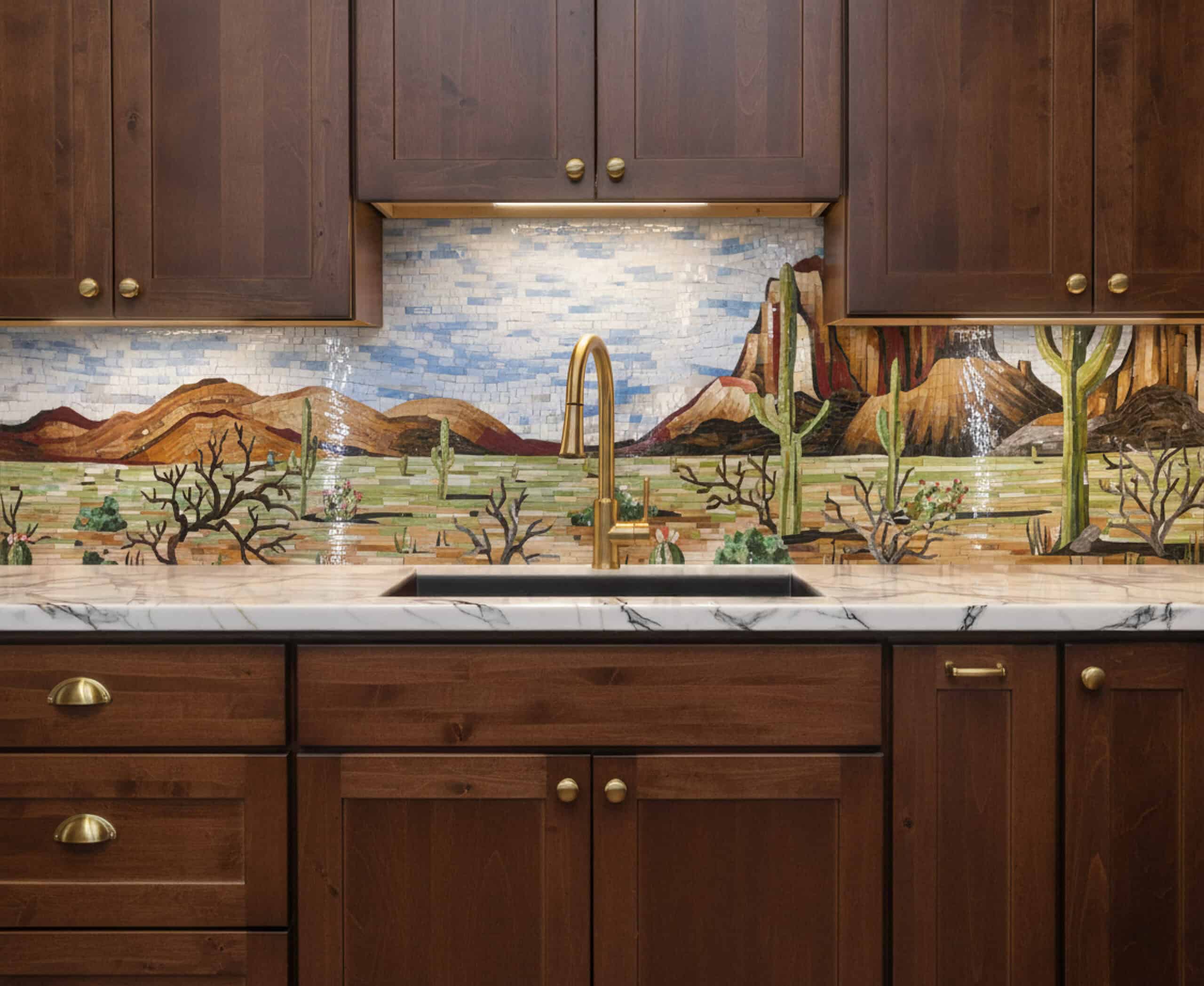 Custom Desert hand-cut mosaic backsplashes, shown in jewel glass, by New Ravenna.