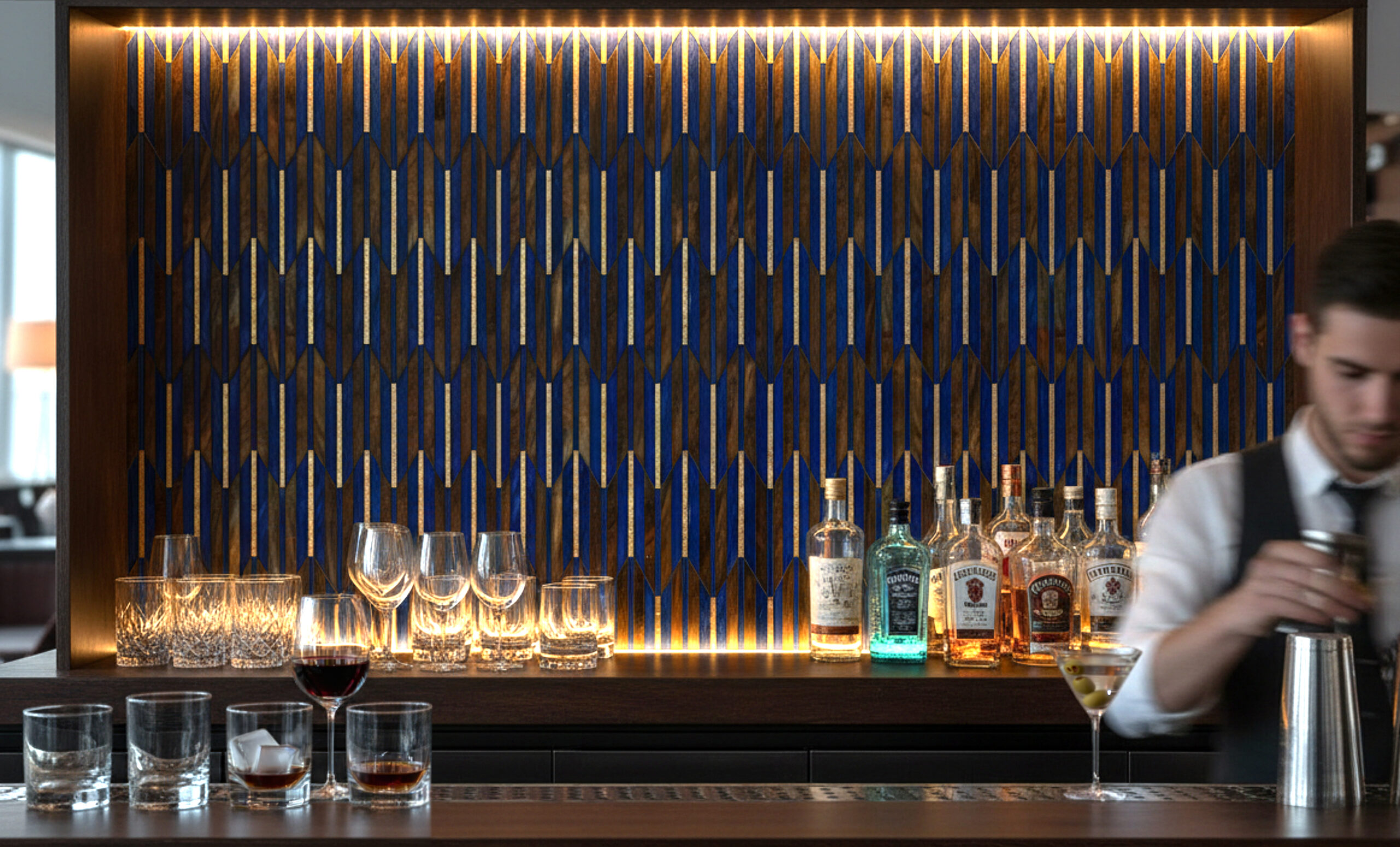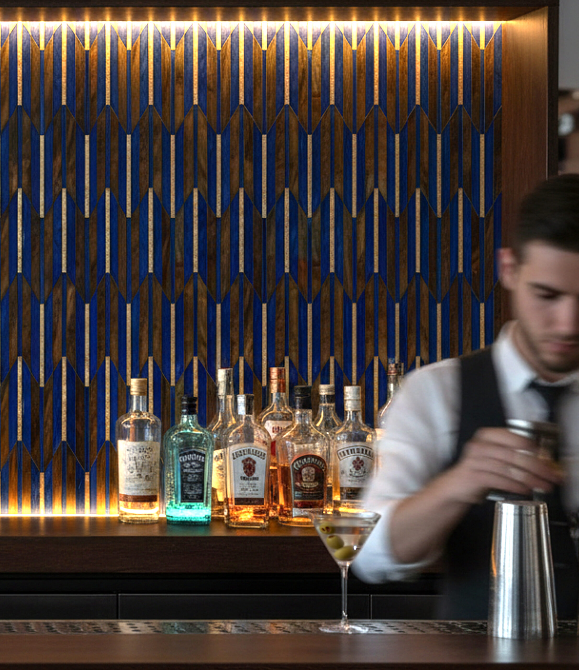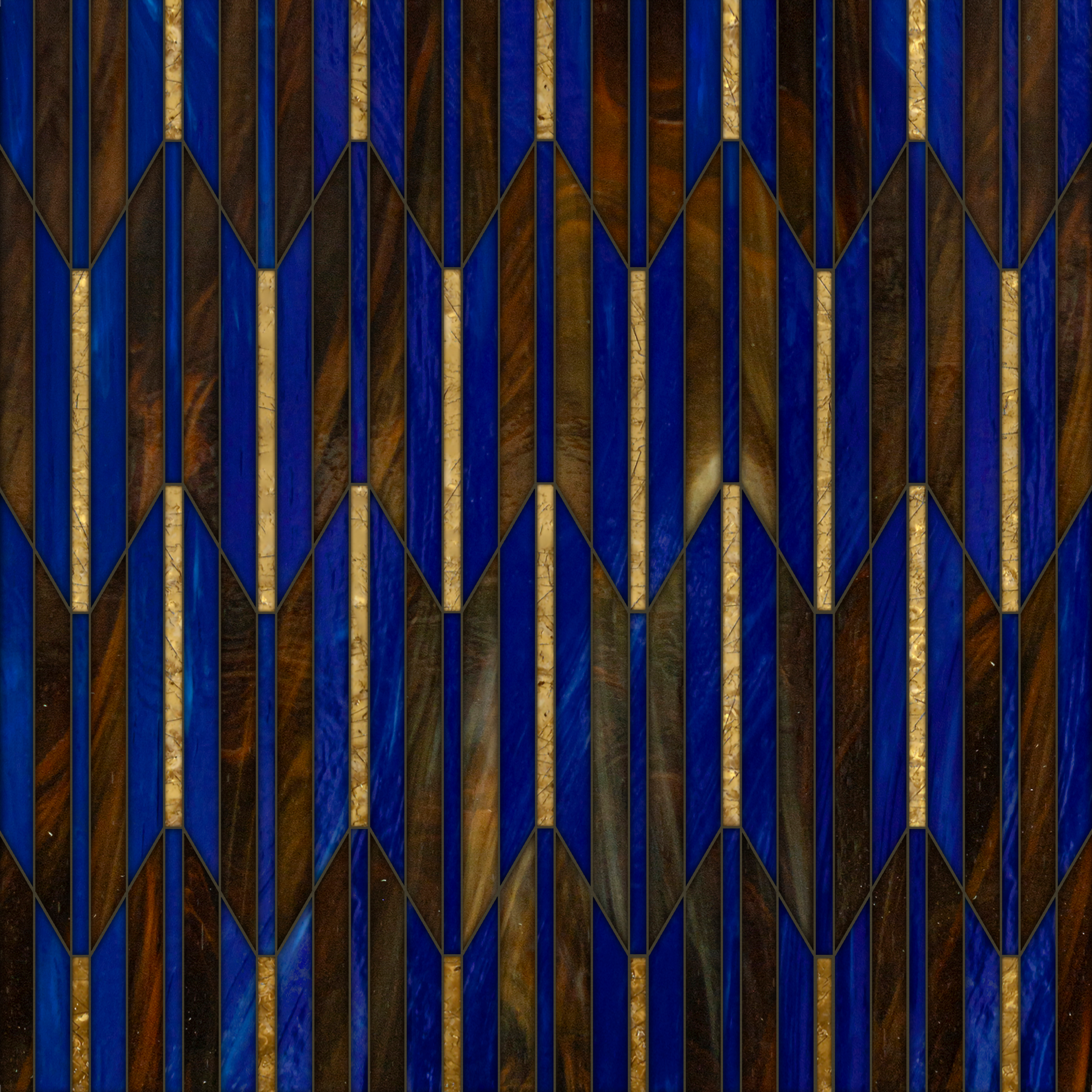 Fletcher, a waterjet mosaic shown in Tortoise Shell, Lapis Lazuli, and 24K Gold glass, is part of the Altimetry® collection by New Ravenna.
