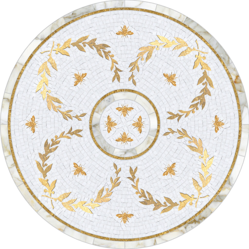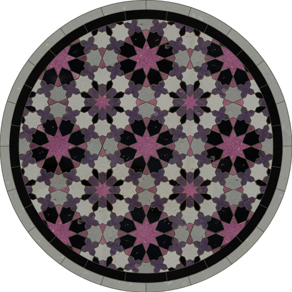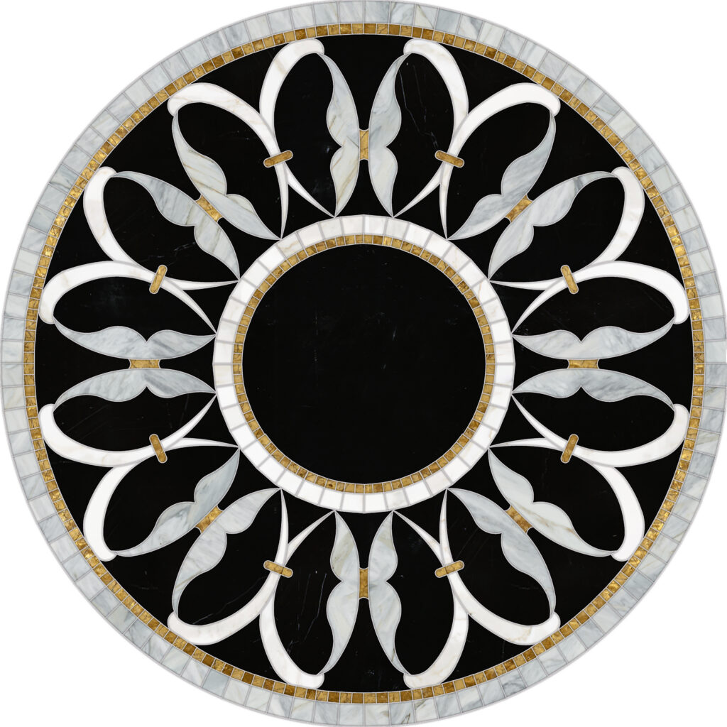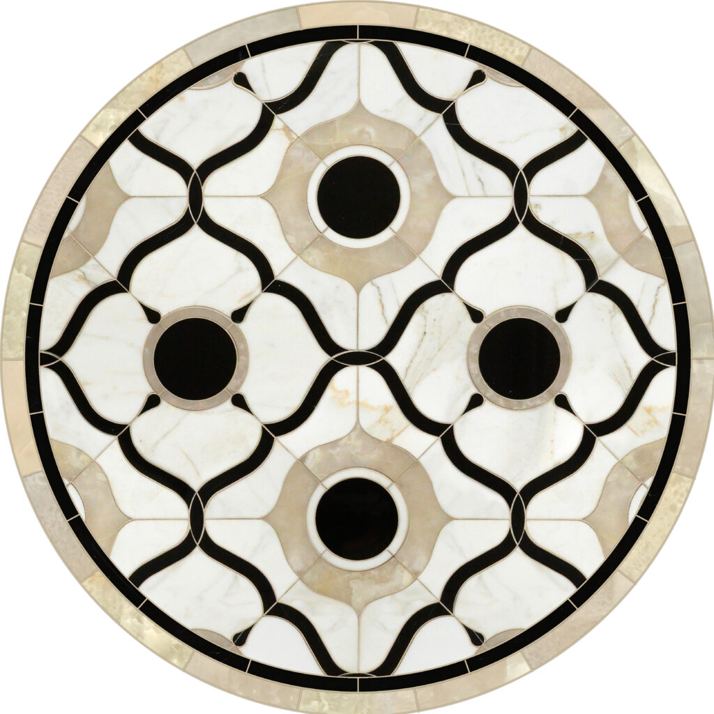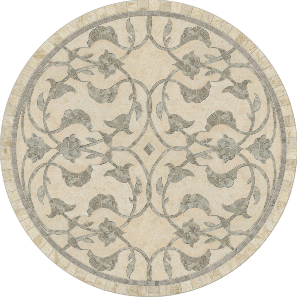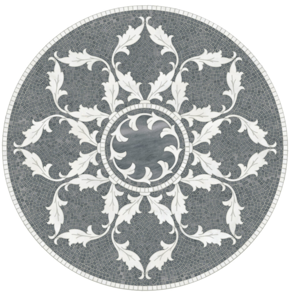 Flowers, a waterjet mosaic shown in Ametrine, Mica, Rhodolite, and Sardonyx, is part of the Erin Adams Collection for New Ravenna.