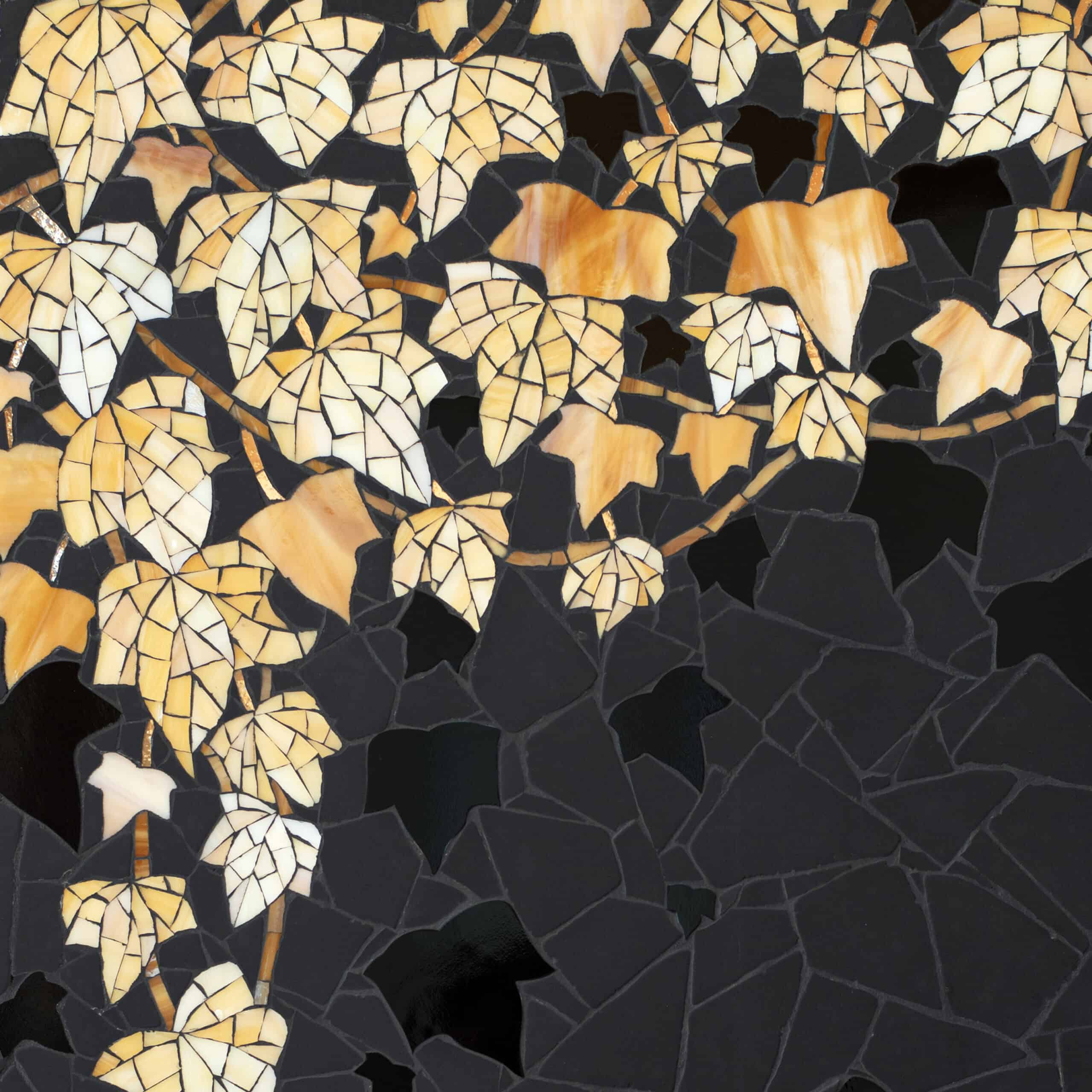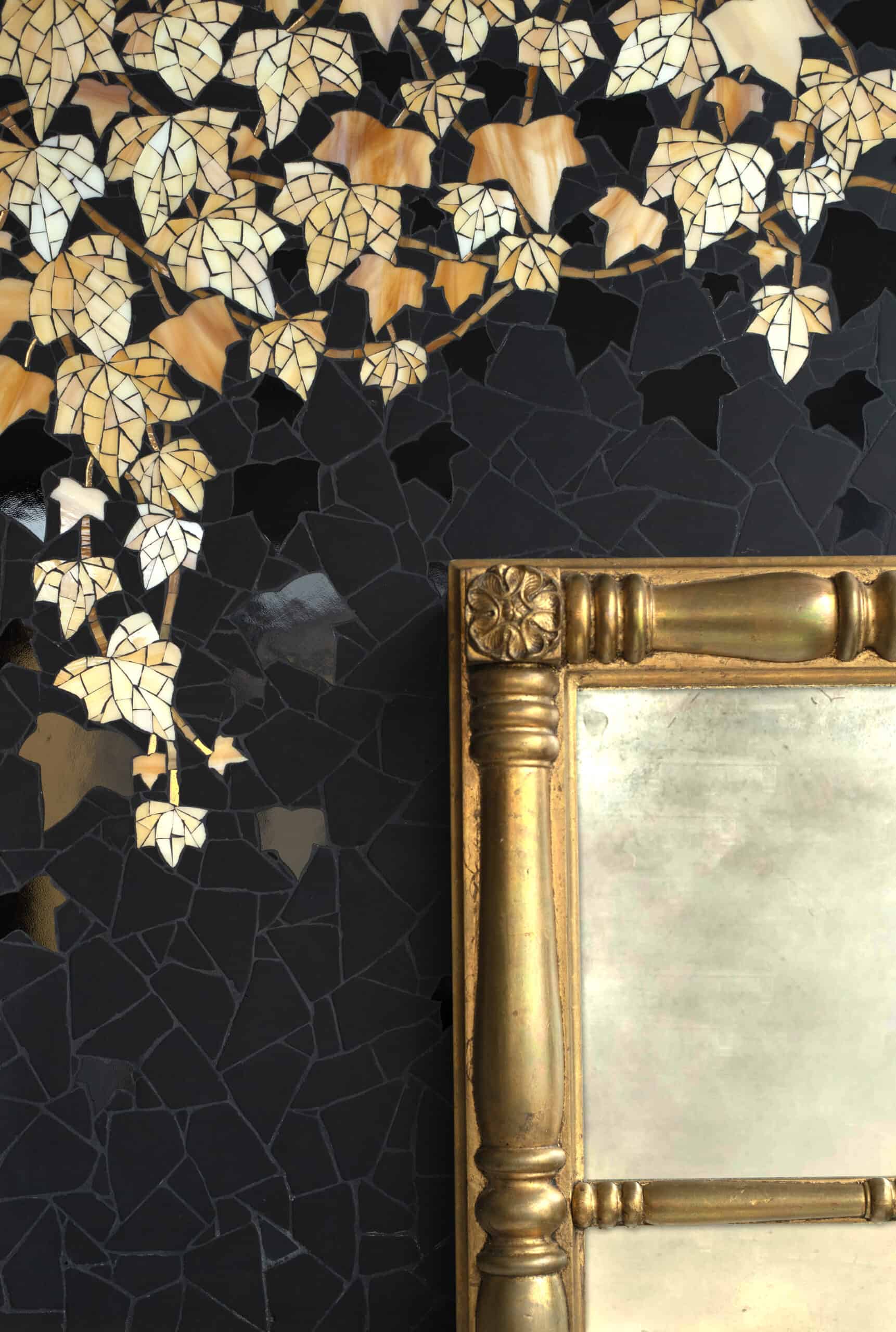 Greenbrier, a hand-cut glass and waterjet mosaic, shown in Obsidian Sea Glass with glossy Obsidian, 24k Gold, Quartz, Amber, is part of the Old Castle collection Jacquelyn Bizzotto for New Ravenna.