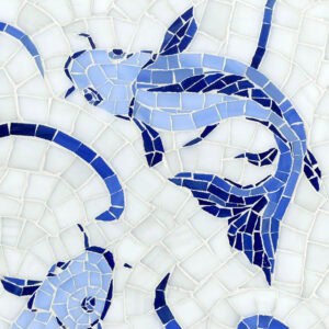 Custom Koi Fish, a hand cut jewel glass mosaic shown in Lapis Lazuli, Iolite, and Covelite with Absolute White Sea Glass™.