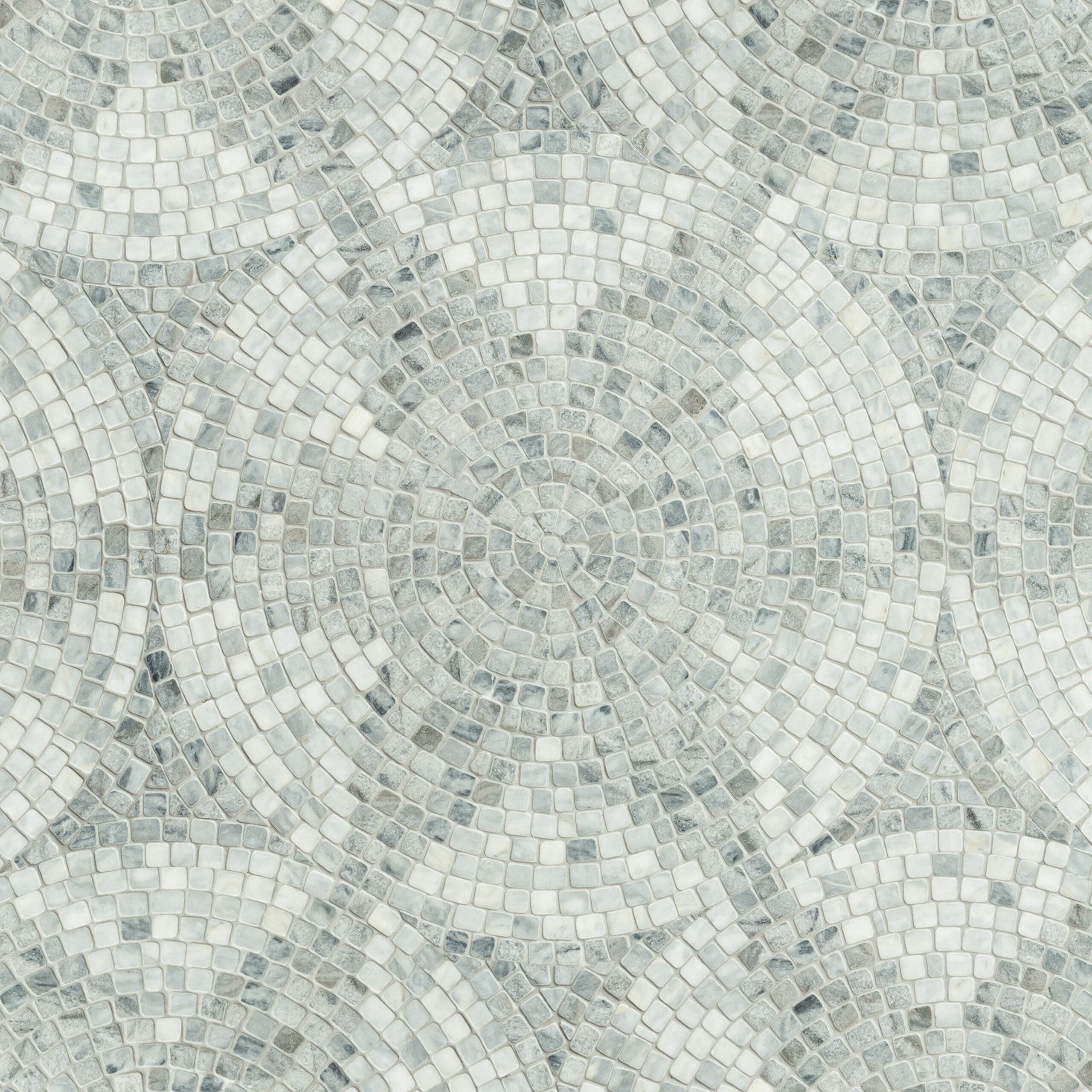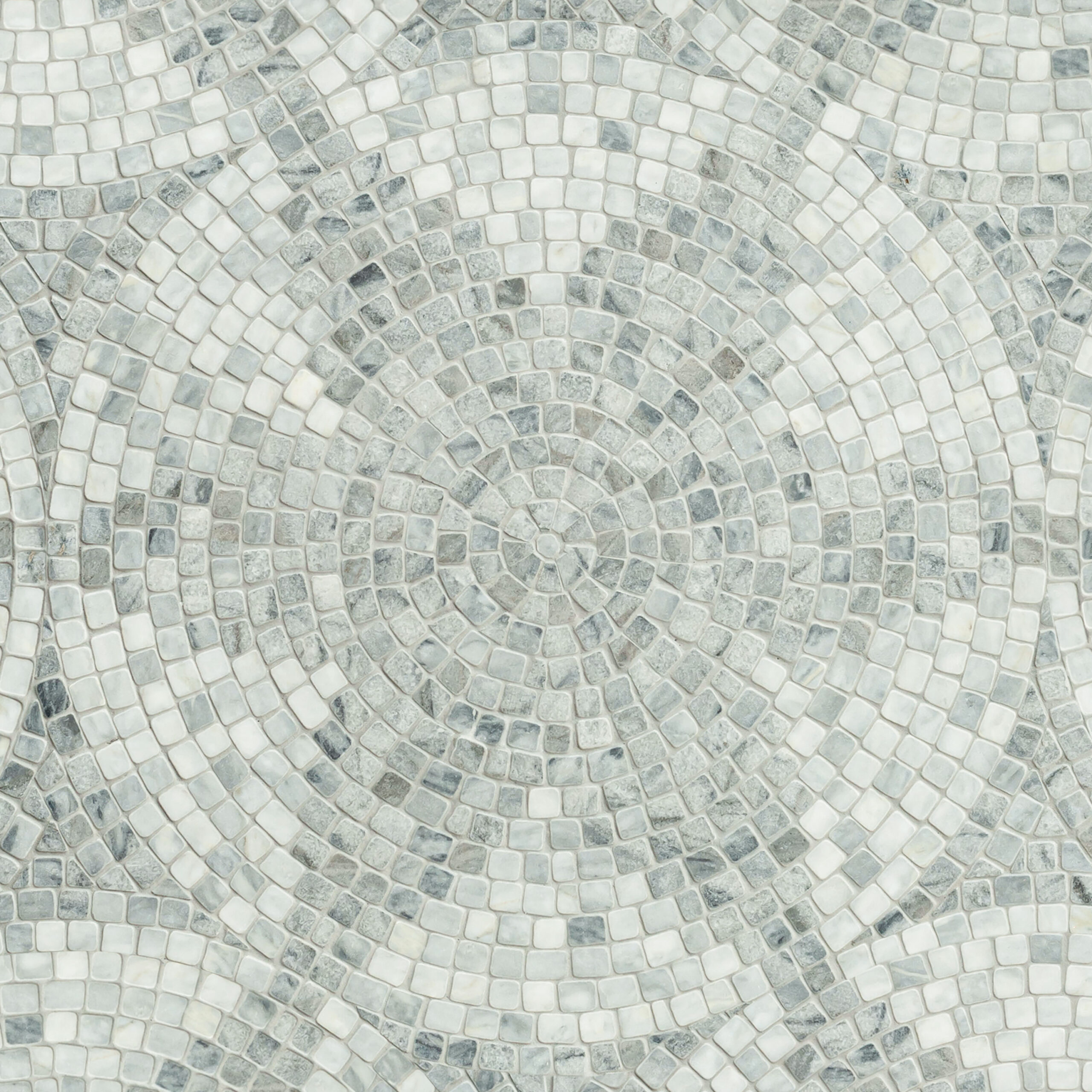 Loretta, a hand-chopped tumbled mosaic, shown in Cirrus and Thunderhead, is part of the Saguaro collection by New Ravenna.
