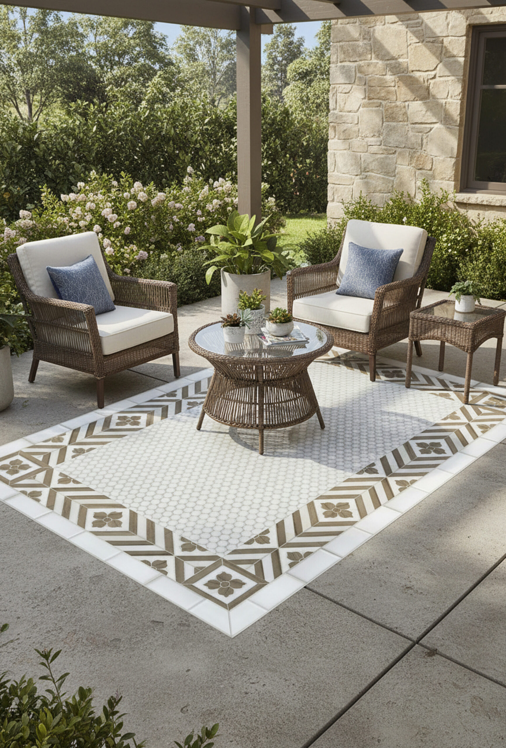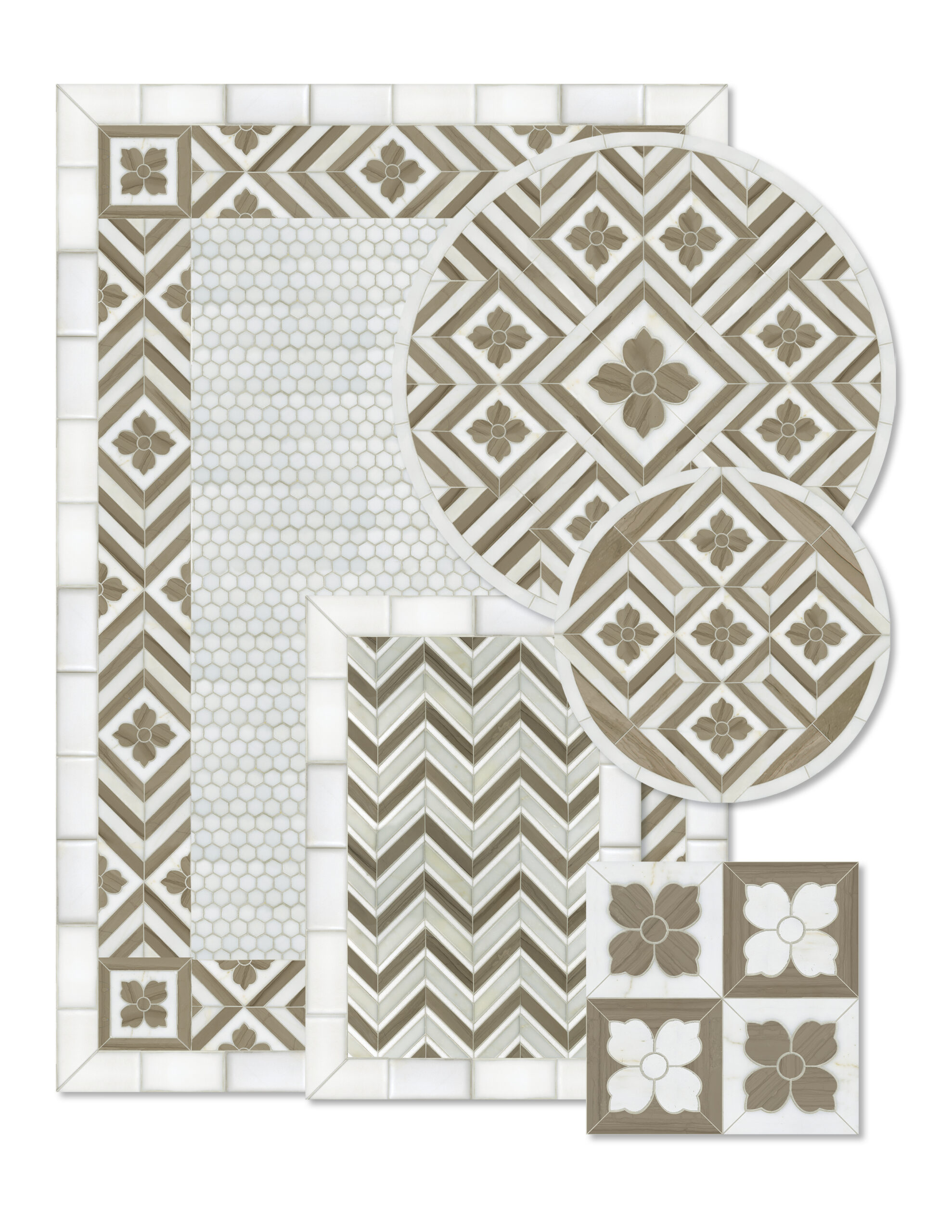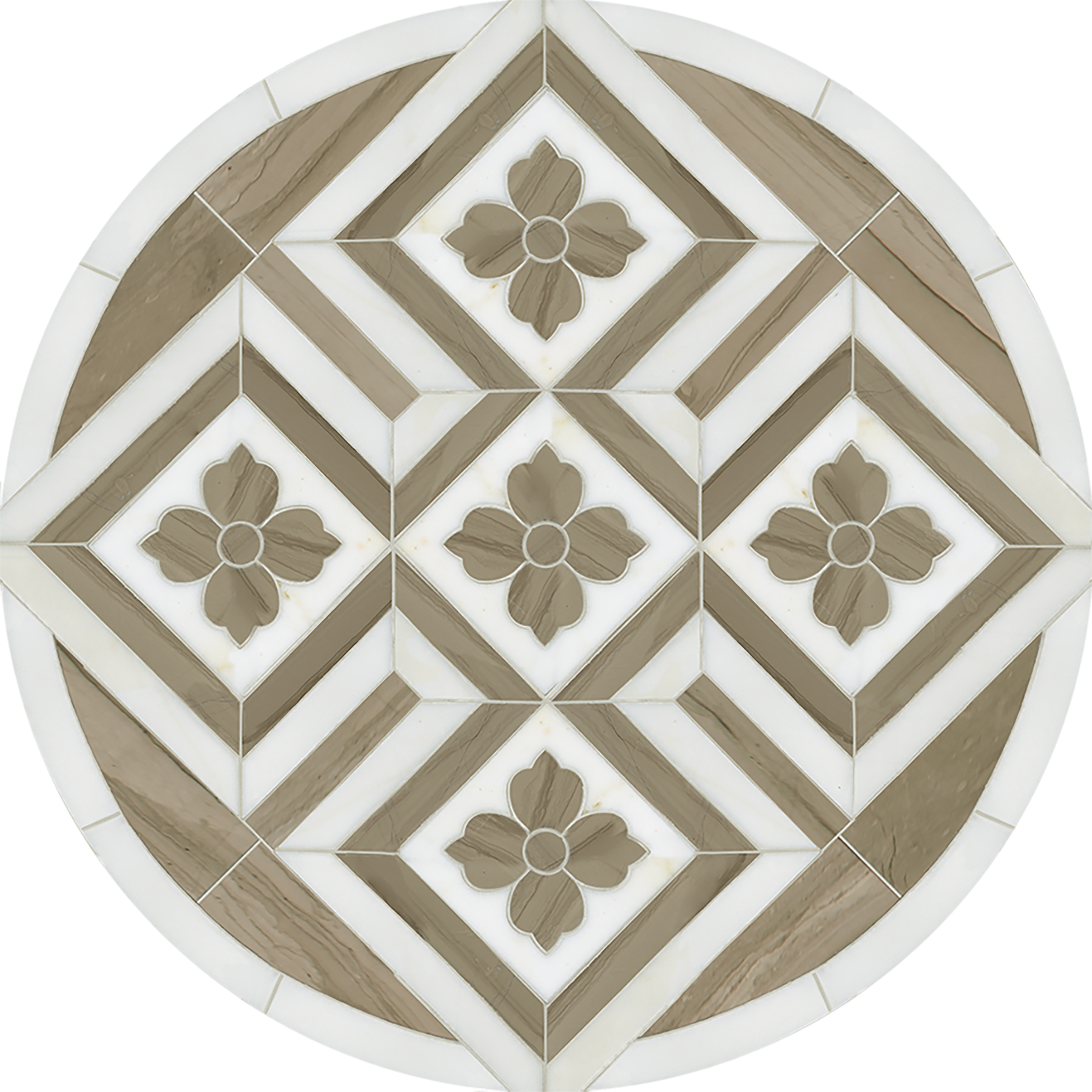 Custom Maharaja Medallions & Rug shown in polished Driftwood and honed Thassos.
