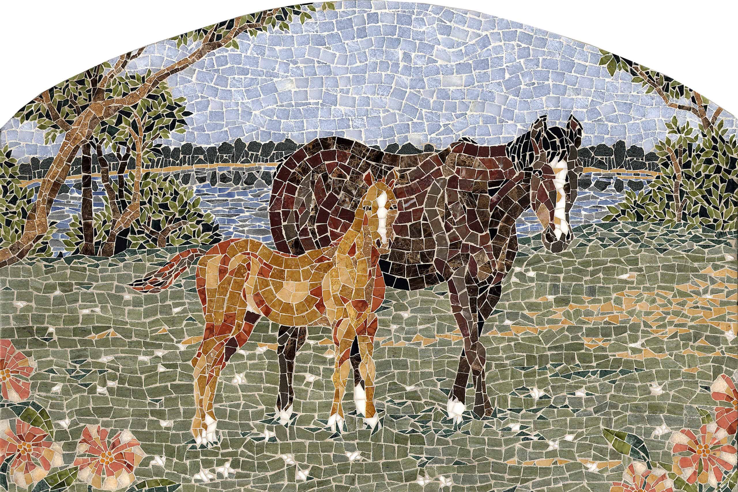 Custom 24″ x 16″ Mother-and-baby horse backsplash shown in hand-cut stone tesserae by New Ravenna.