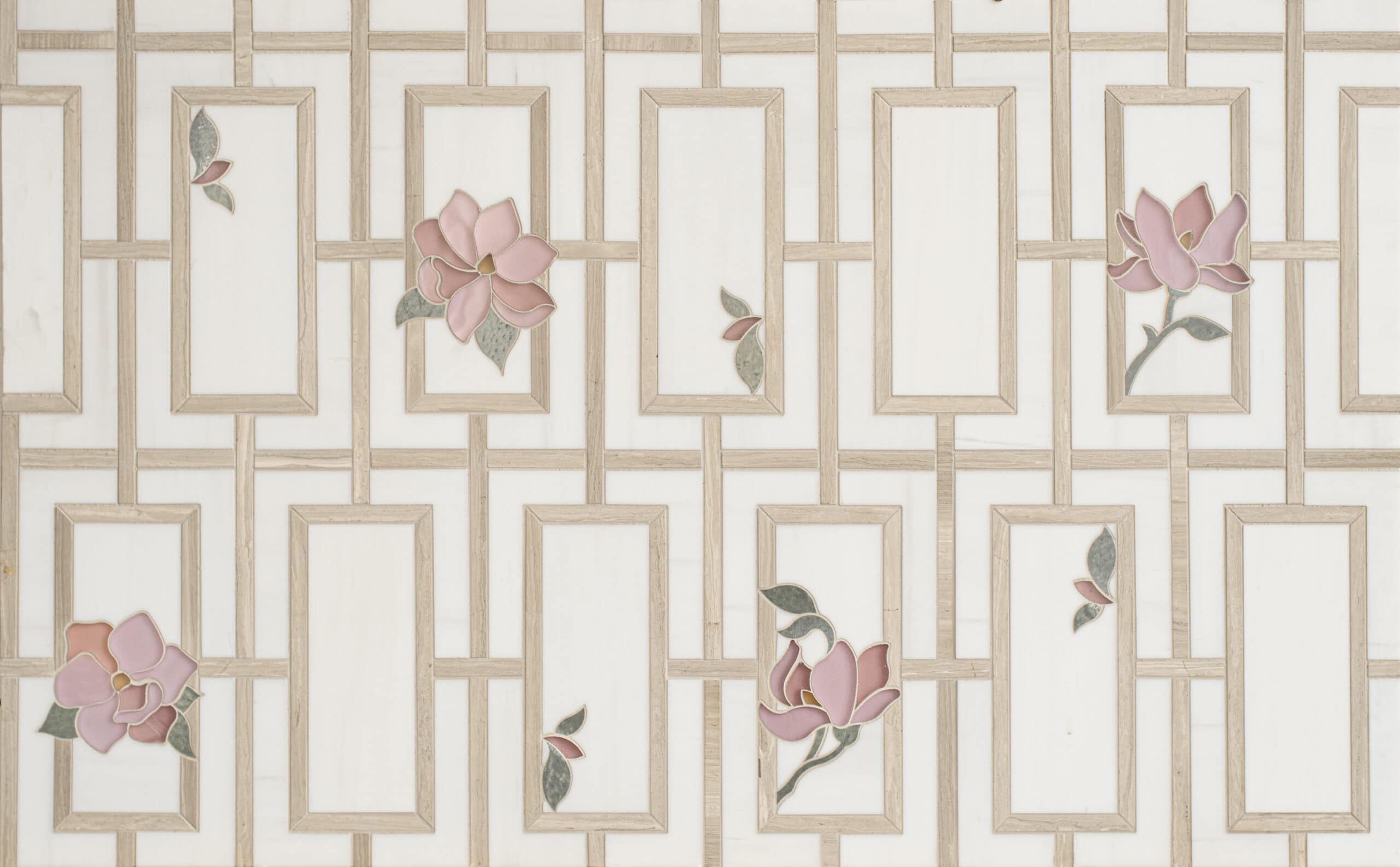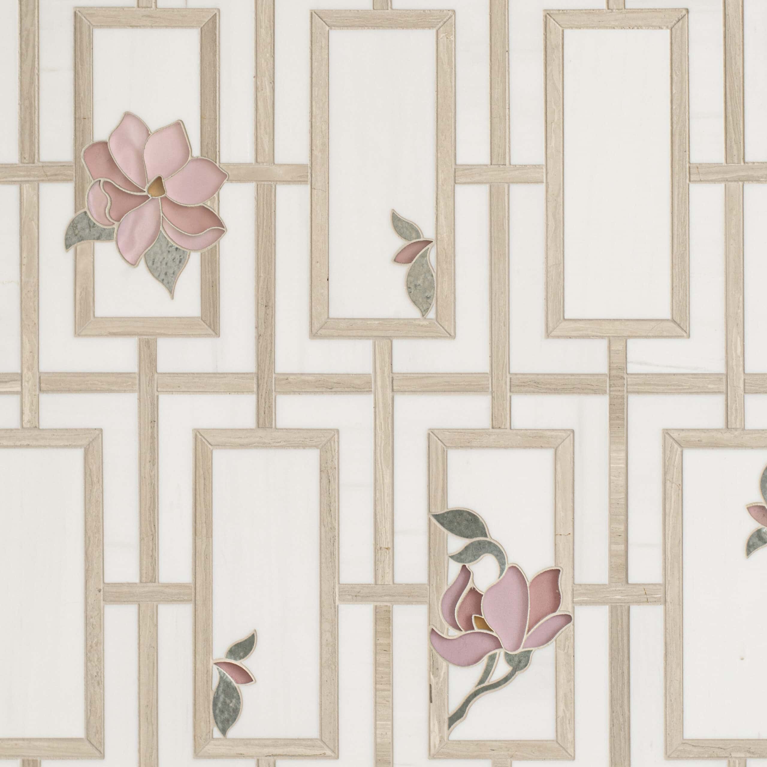 Sweetbay, a waterjet stone mosaic, shown in honed Dolomite, Whitewood, polished Eucalyptus, glossy Harvest, Rose Petal, and Anemone, is part of the Old Castle collection Jacquelyn Bizzotto for New Ravenna.
