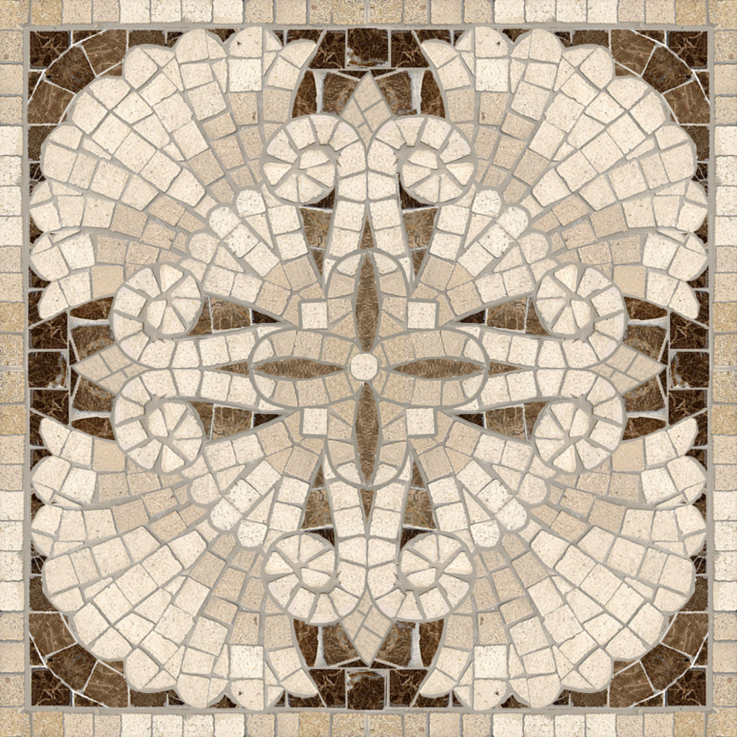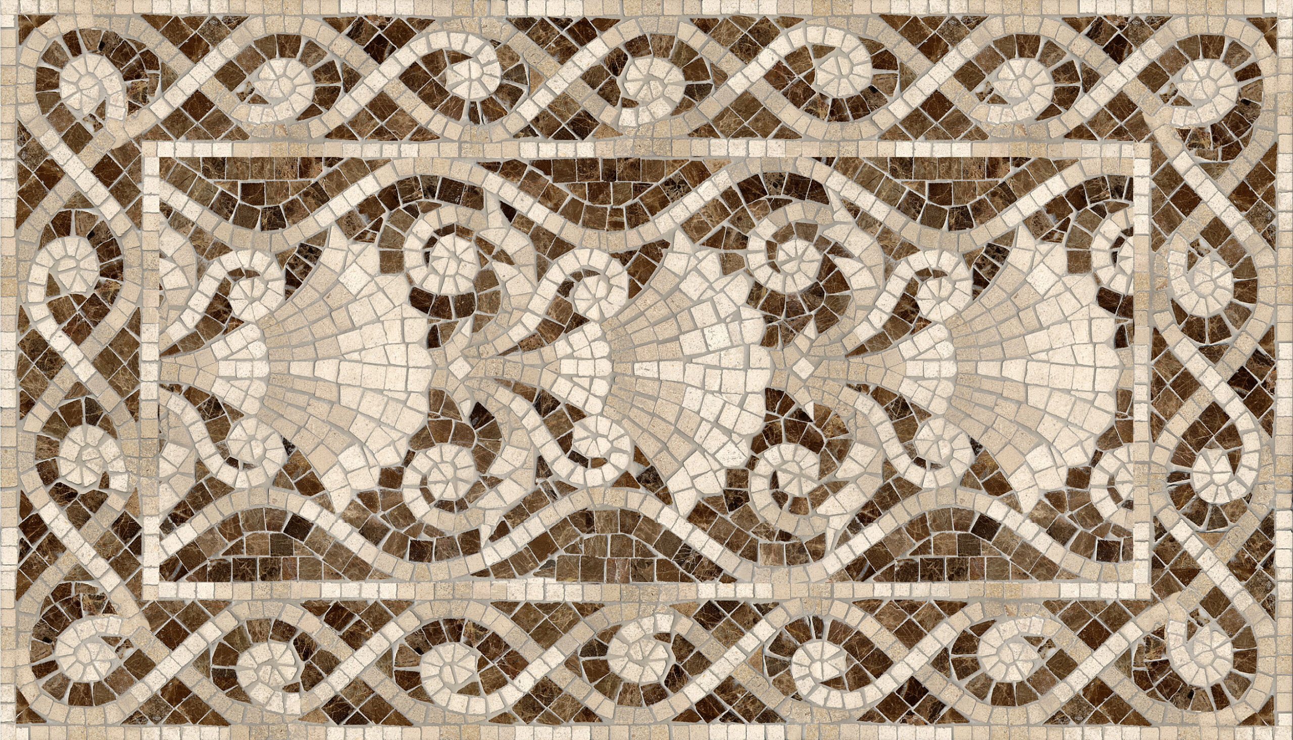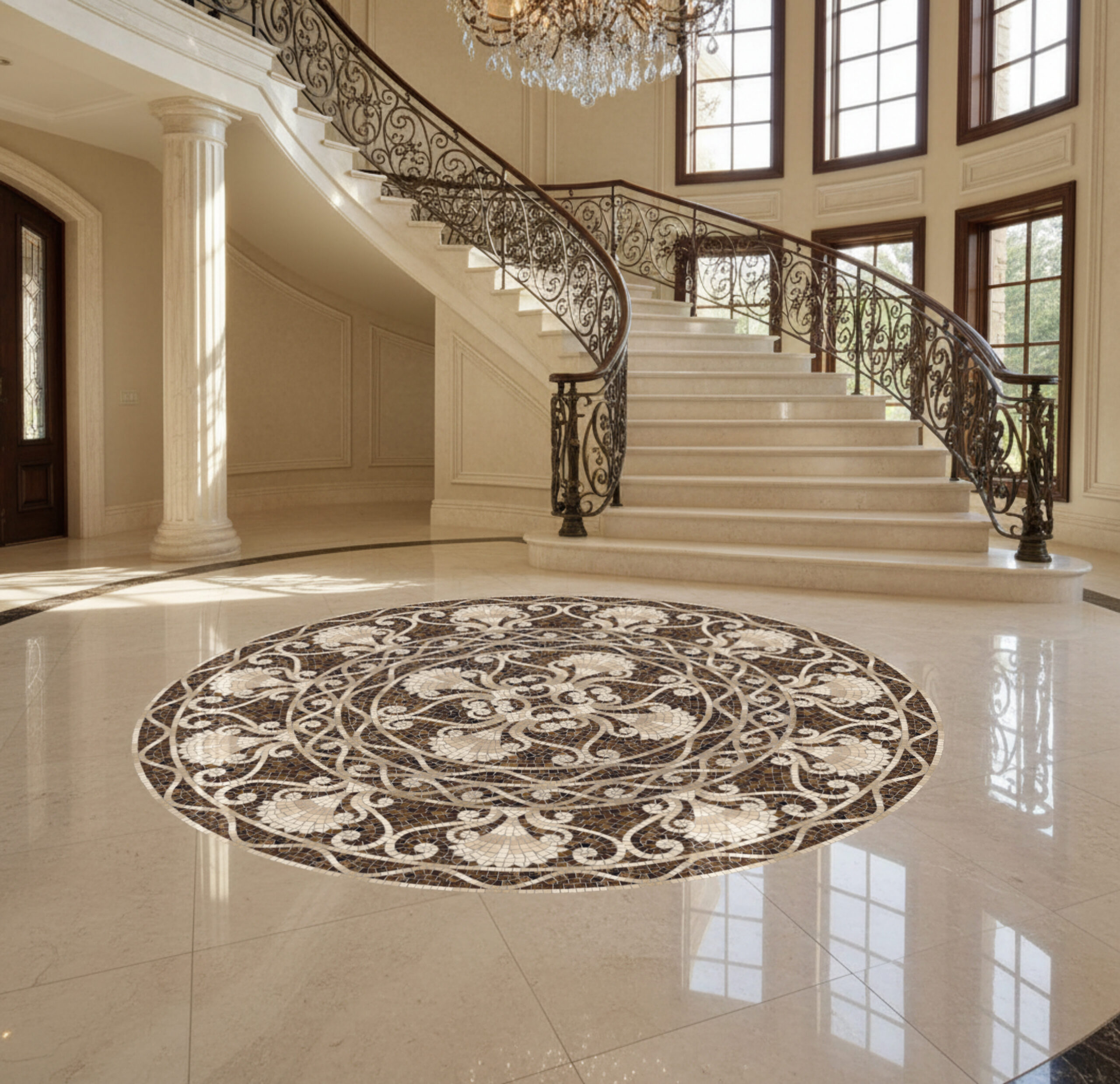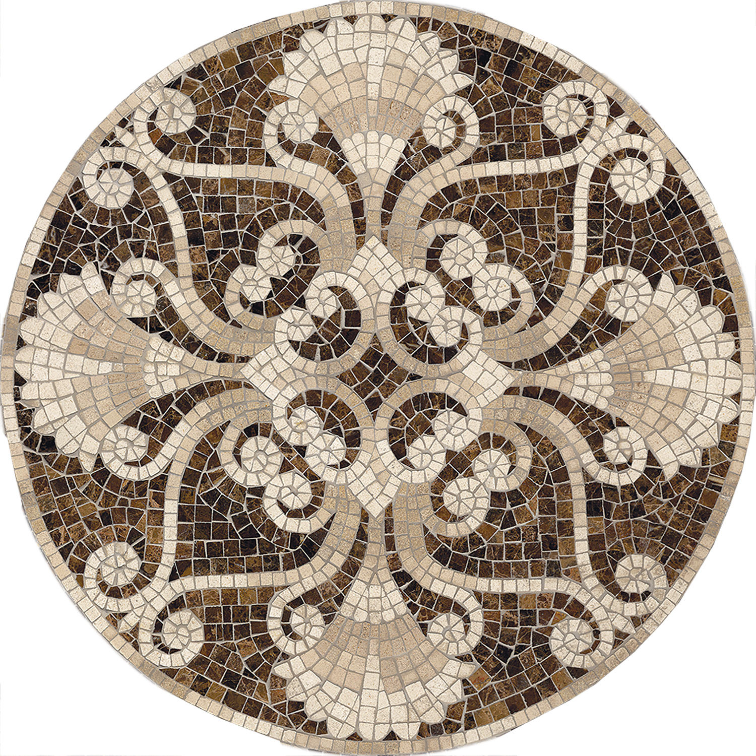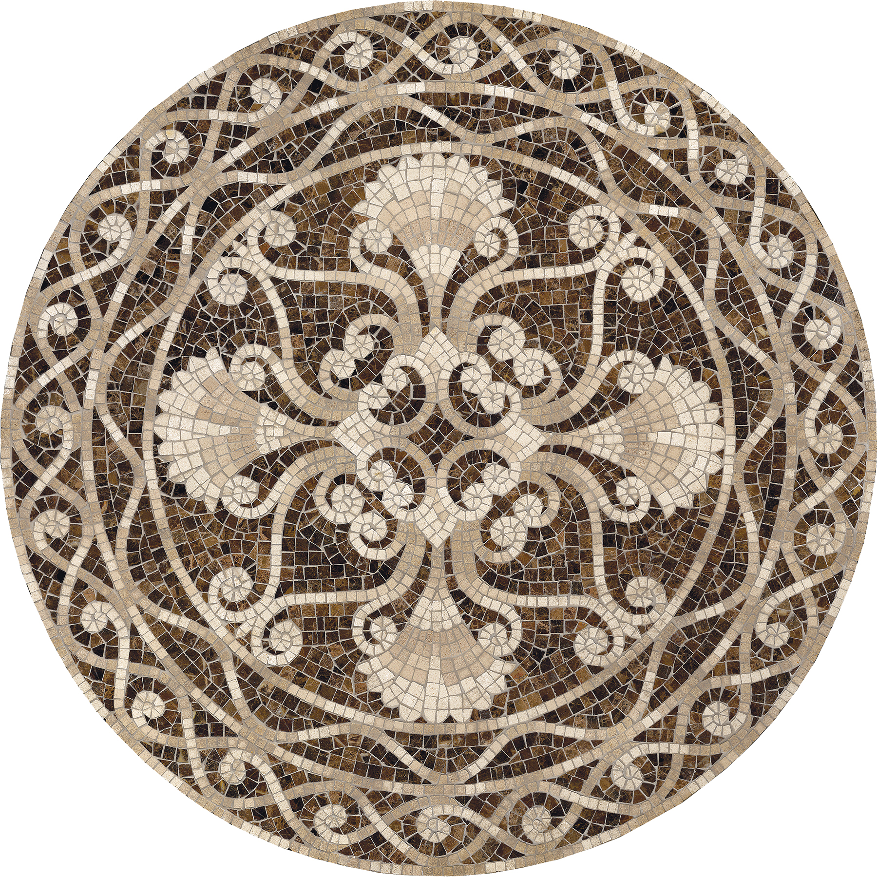 Custom Tatiana Medallions and Rugs shown in polished Emperador Dark, honed Lavigne, Saint Vincent, Saint Richard, and Ivory Cream.