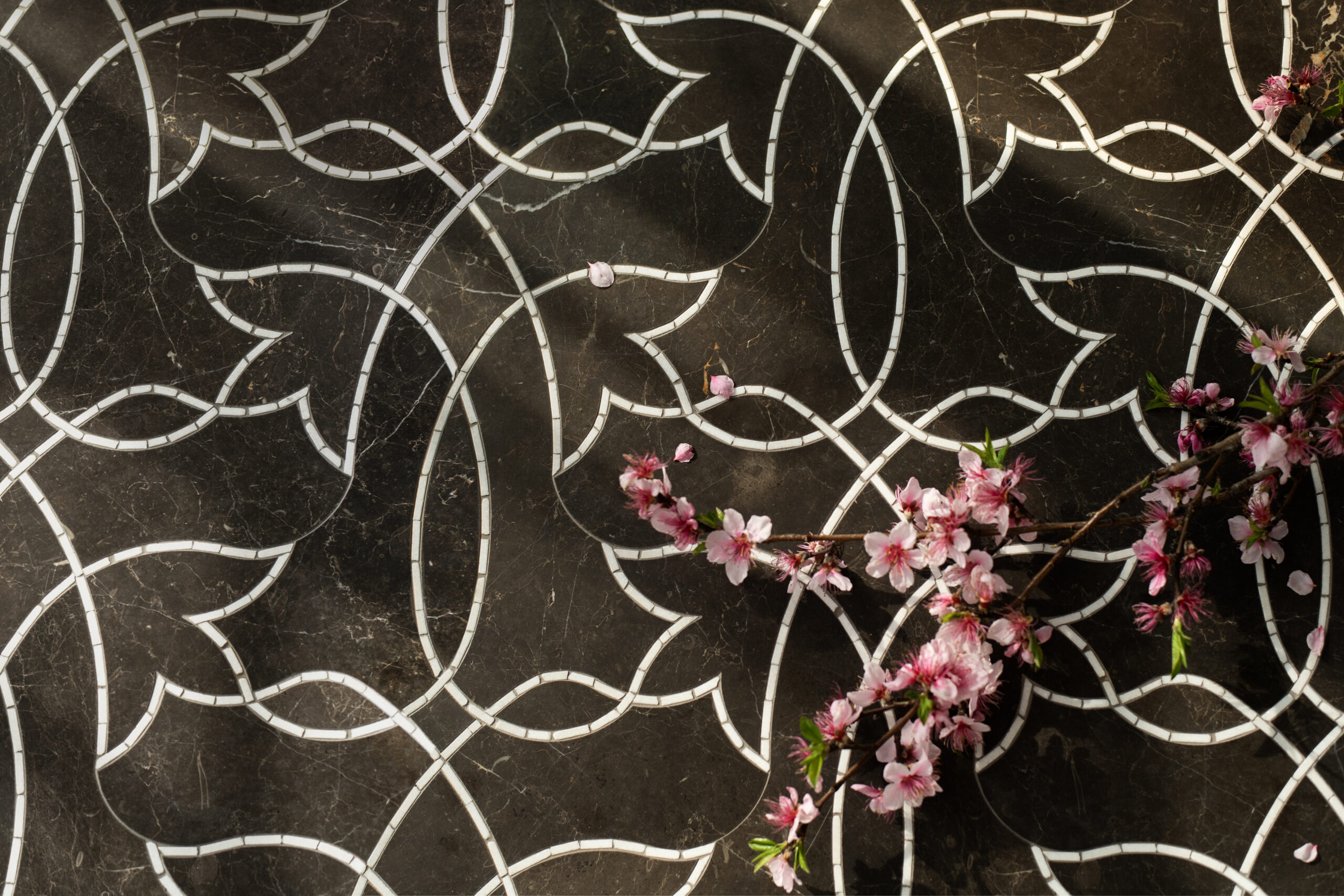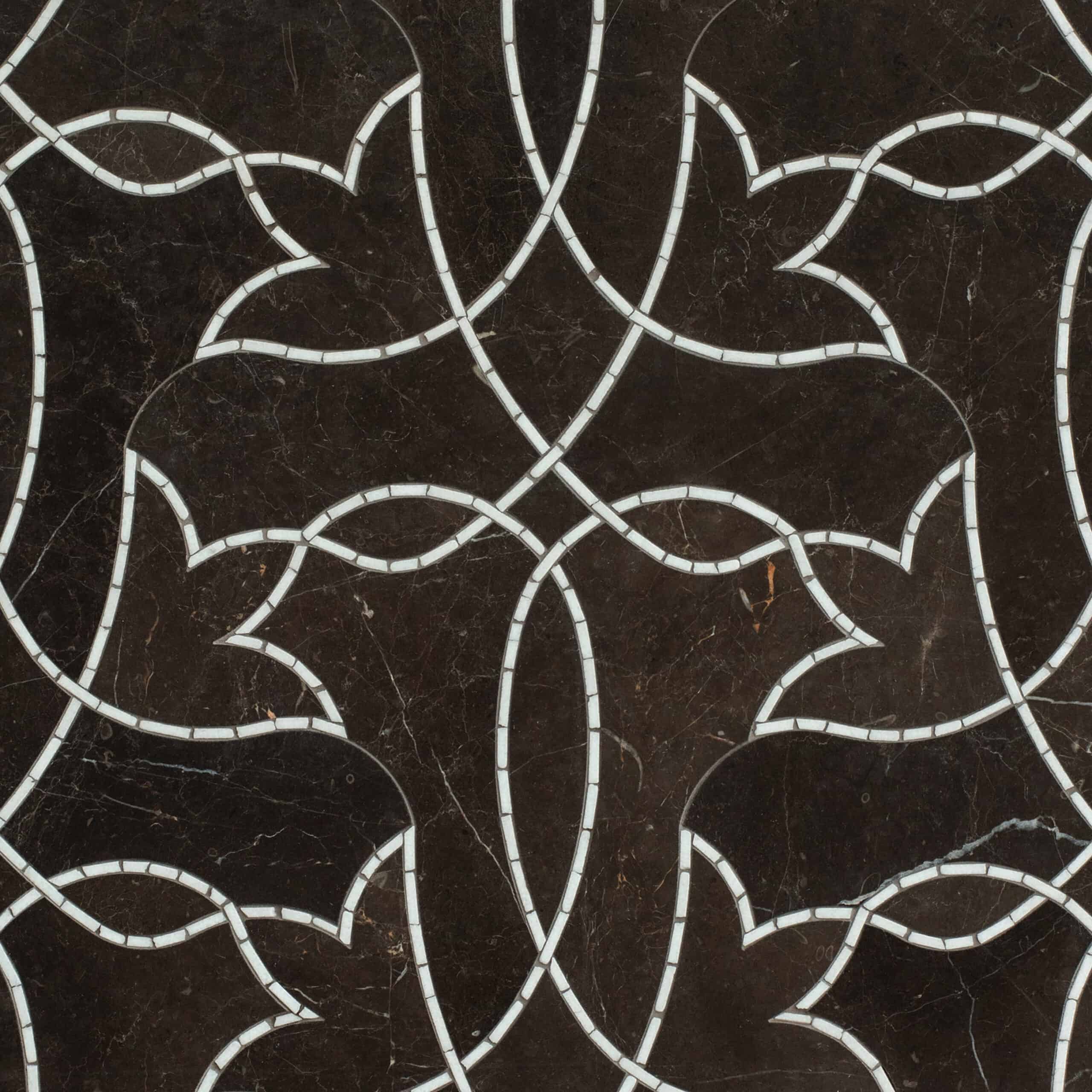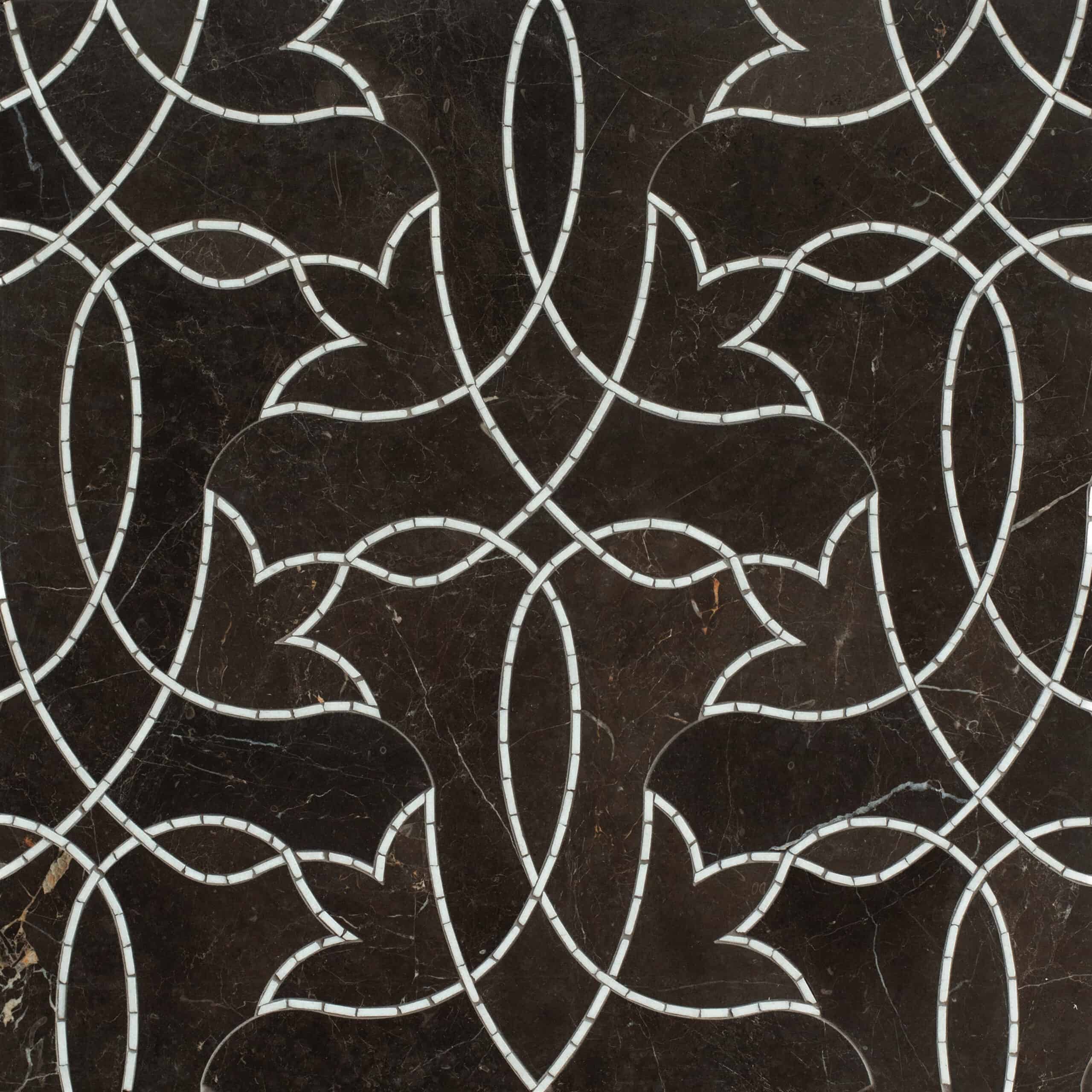 Waylon, a hand-cut and waterjet stone mosaic, shown in venetian honed Saint Laurent and tumbled Thassos, is part of the Saguaro collection by New Ravenna.
