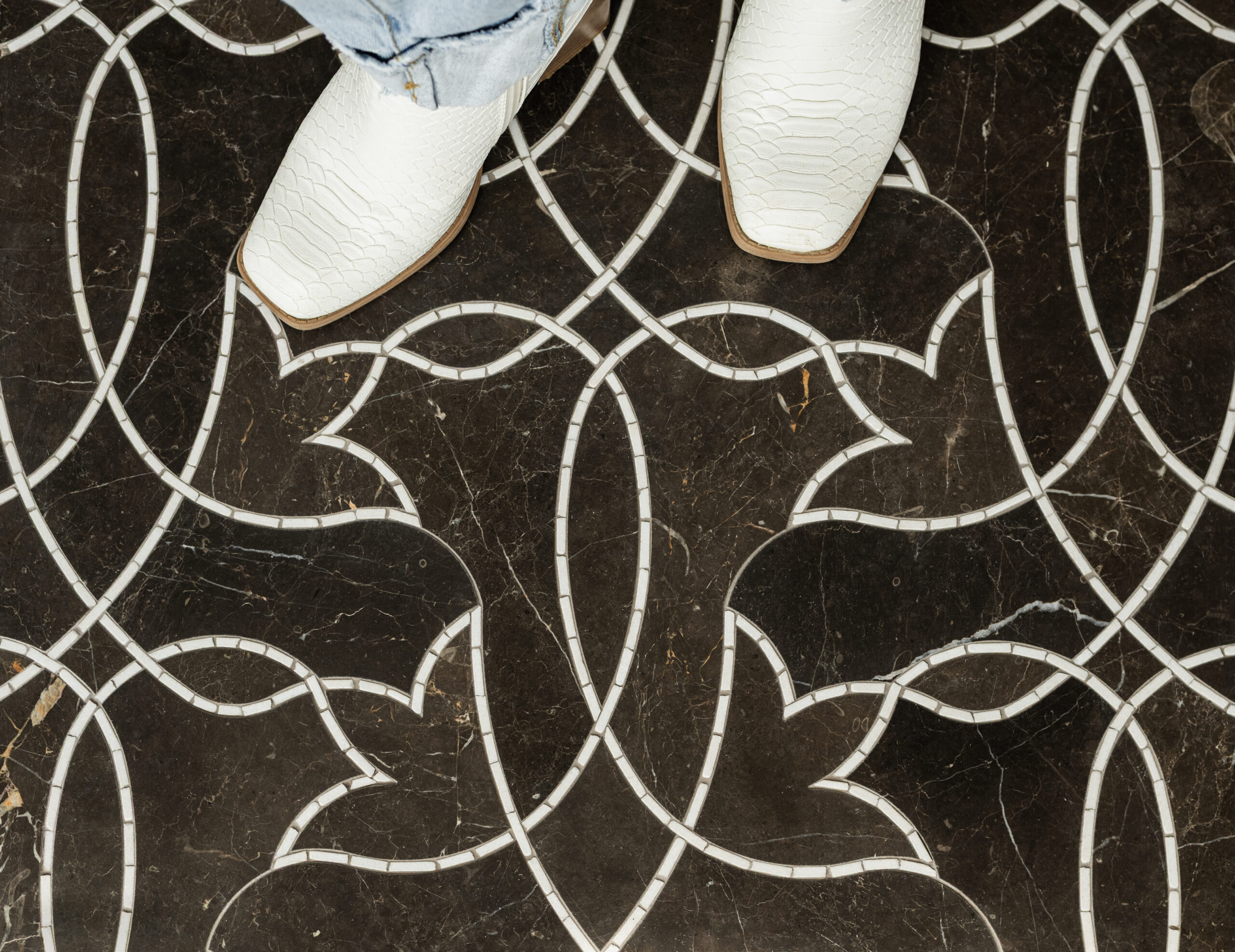 Waylon, a hand-cut and waterjet stone mosaic, shown in venetian honed Saint Laurent and tumbled Thassos , is part of the Saguaro collection by New Ravenna.